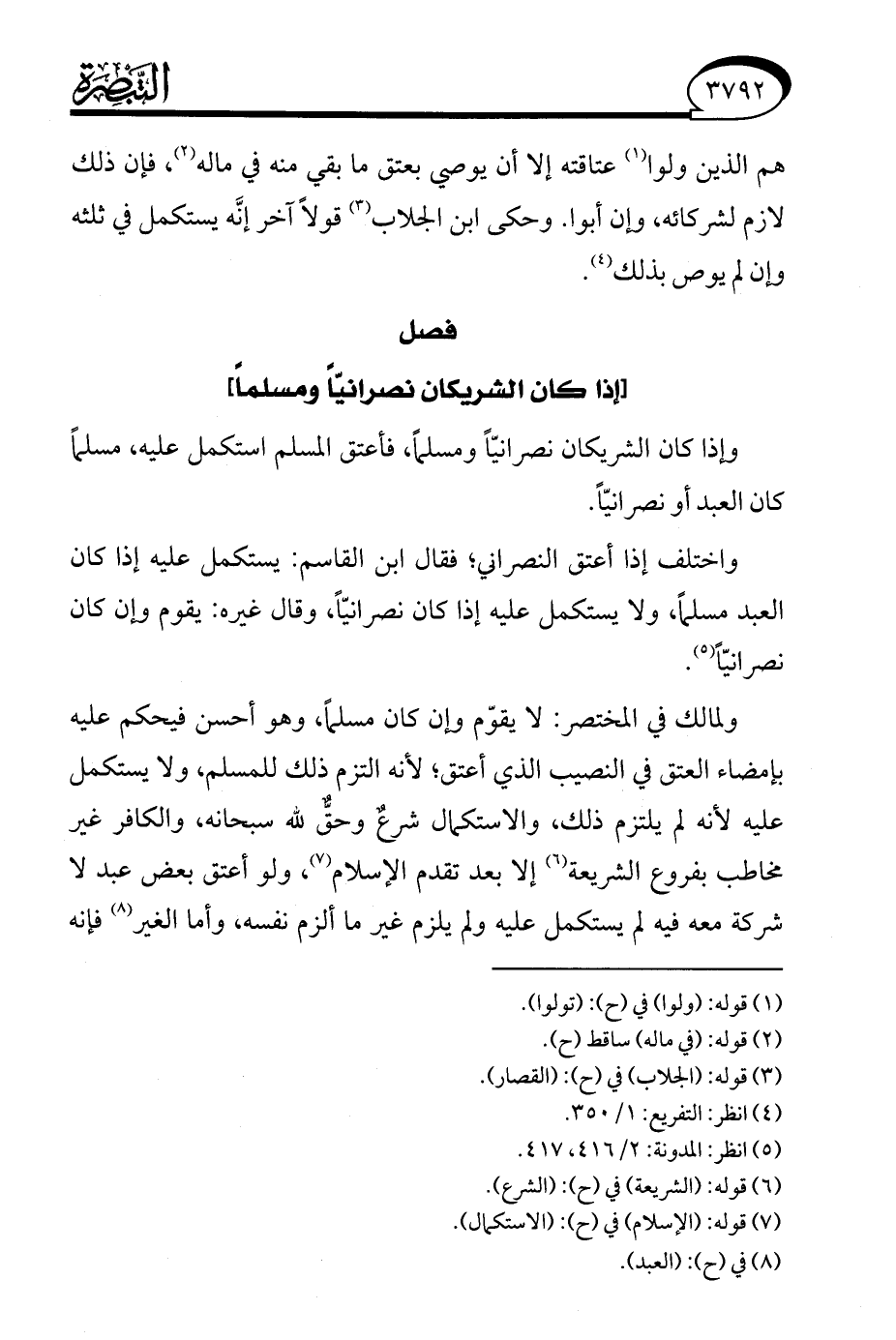 واختلف إذا أعتق النصراني، فقال ابن القاسم: يستكمل عليه إذا كان العبد مسلمًا، ولا يستكمل عليه إذا كان نصرانيًّا، وقال غيره: يقوم وإن كان نصرانيًّا (¬5).