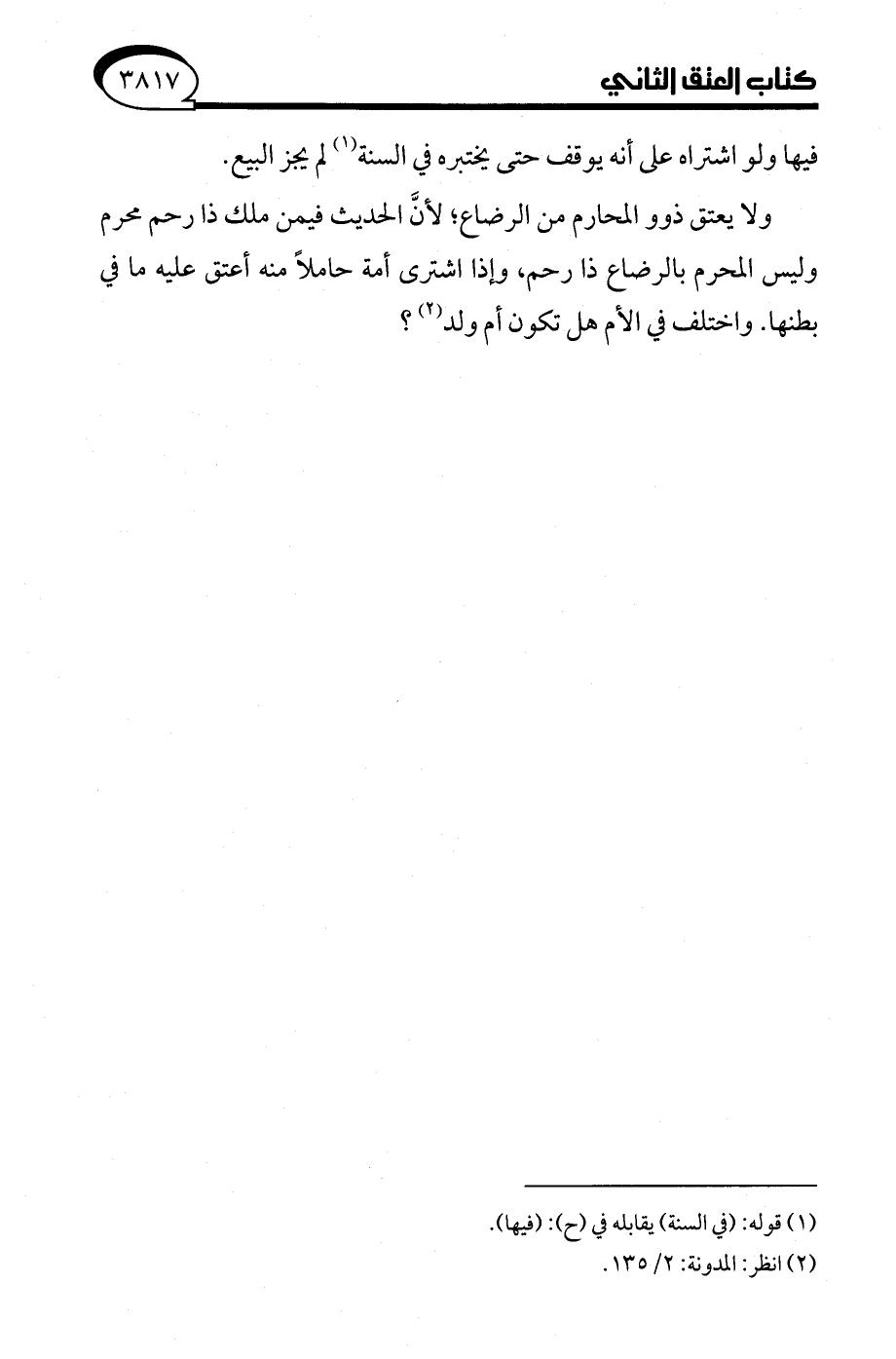 ولا يعتق ذوو المحارم من الرضاع؛ لأنَّ الحديث فيمن ملك ذا رحم محرم وليس المحرم بالرضاع ذا رحم، وإذا اشترى أمة حاملًا منه أعتق عليه ما في بطنها. واختلف في الأم هل تكون أم ولد (¬2)؟