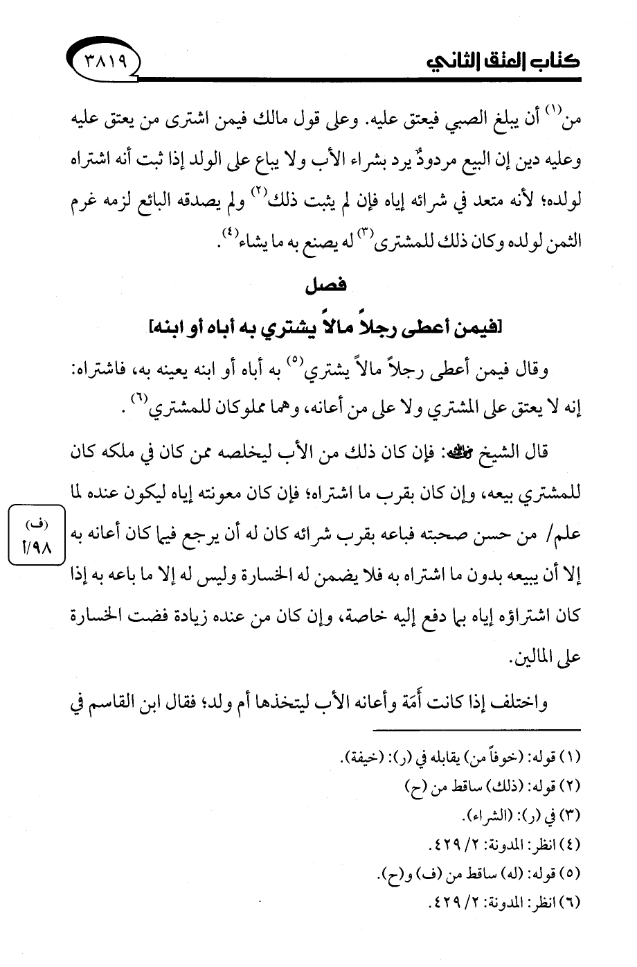 من (¬1) أن يبلغ الصبي فيعتق عليه. وعلى قول مالك فيمن اشترى من يعتق عليه وعليه دين إن البيع مردودٌ يرد بشراء الأب ولا يباع على الولد إذا ثبت أنه اشتراه لولده؛ لأنه متعد في شرائه إياه فإن لم يثبت ذلك (¬2) ولم يصدقه البائع لزمه غرم الثمن لولده وكان ذلك للمشترى (¬3) له يصنع به ما يشاء (¬4).