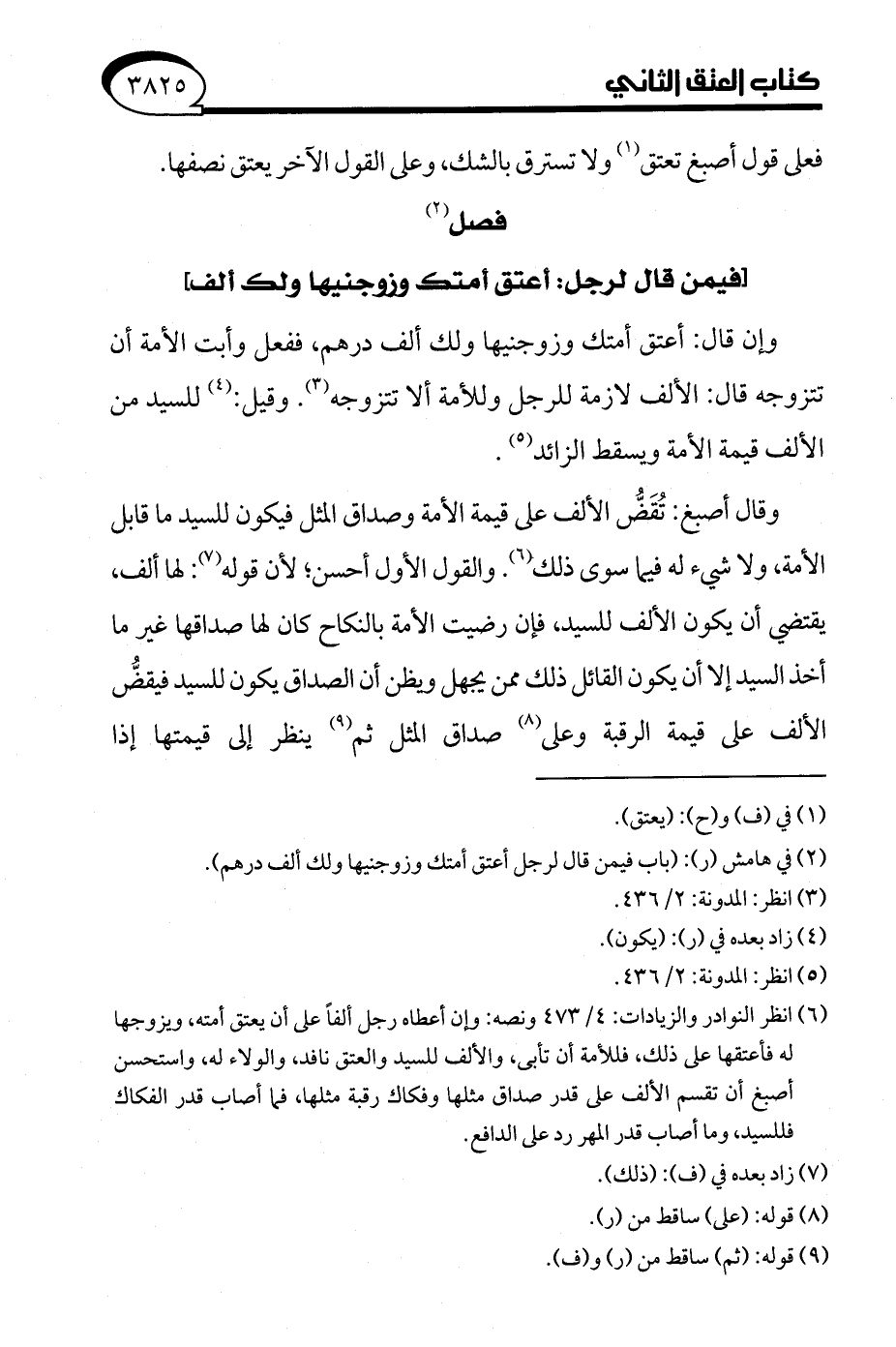 (¬6) انظر النوادر والزيادات: 4/ 473 ونصه: وإن أعطاه رجل ألفًا على أن يعتق أمته، ويزوجها له فأعتقها على ذلك، فللأمة أن تأبى، والألف للسيد والعتق نافد، والولاء له، واستحسن أصبغ أن تقسم الألف على قدر صداق مثلها وفكاك رقبة مثلها، فما أصاب قدر الفكاك فللسيد، وما أصاب قدر المهر رد على الدافع.