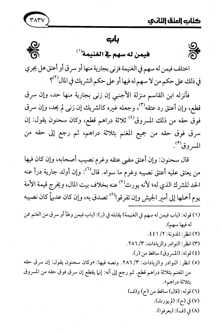 (¬5) انظر: النوادر والزيادات: 3/ 286. ونصه فيها: "وكان سحنون يقول: إن سرق حقه من المغنم بثلاثة دراهم قطع. ثم رجع إلى أنه: إنما يقطع إن سرق فوق حقه من المسروق بثلاثة دراهم".