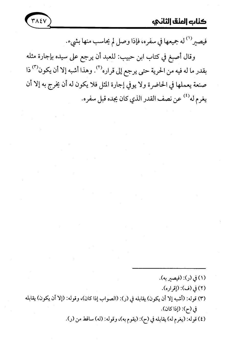 وقال أصبغ في كتاب ابن حبيب: للعبد أن يرجع على سيده بإجارة مثله بقدر ما له فيه من الحرية حتى يرجع إلى قراره (¬2). وهذا أشبه إلا أن يكون (¬3) ذا صنعة يعملها في الحاضرة ولا يوفي إجارة المثل فلا يكون له أن يخرج به إلا أن يغرم له (¬4) عن نصف القدر الذي كان يجده قبل سفره.