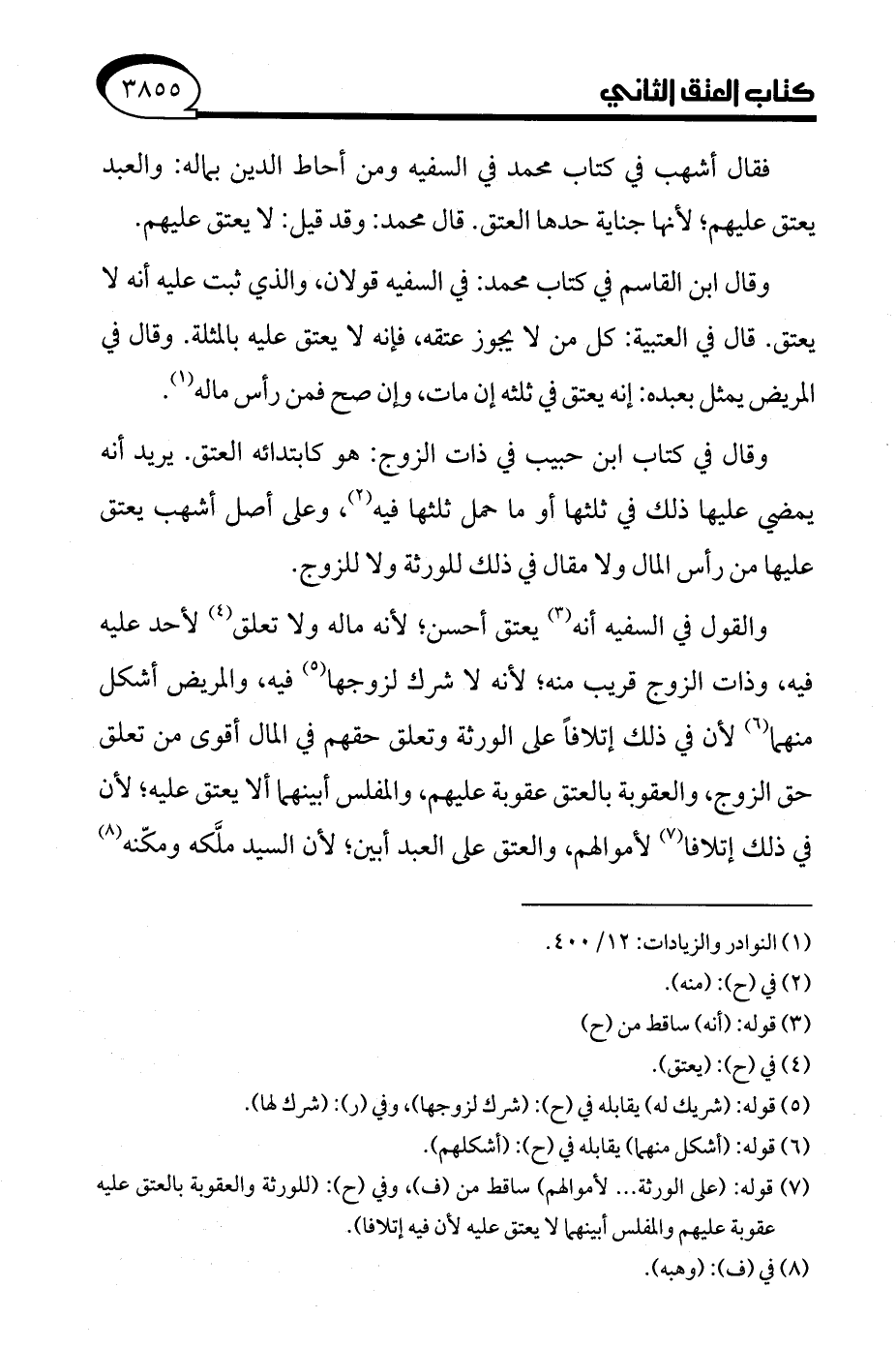 والقول في السفيه أنه (¬3) يعتق أحسن؛ لأنه ماله ولا تعلق (¬4) لأحد عليه فيه، وذات الزوج قريب منه؛ لأنه لا شرك لزوجها (¬5) فيه، والمريض أشكل منهما (¬6) لأن في ذلك إتلافًا على الورثة وتعلق حقهم في المال أقوى من تعلق حق الزوج، والعقوبة بالعتق عقوبة عليهم، والمفلس أبينهما ألا يعتق عليه؛ لأن في ذلك إتلافا (¬7) لأموالهم، والعتق على العبد أبين؛ لأن السيد ملَّكه ومكّنه (¬8)