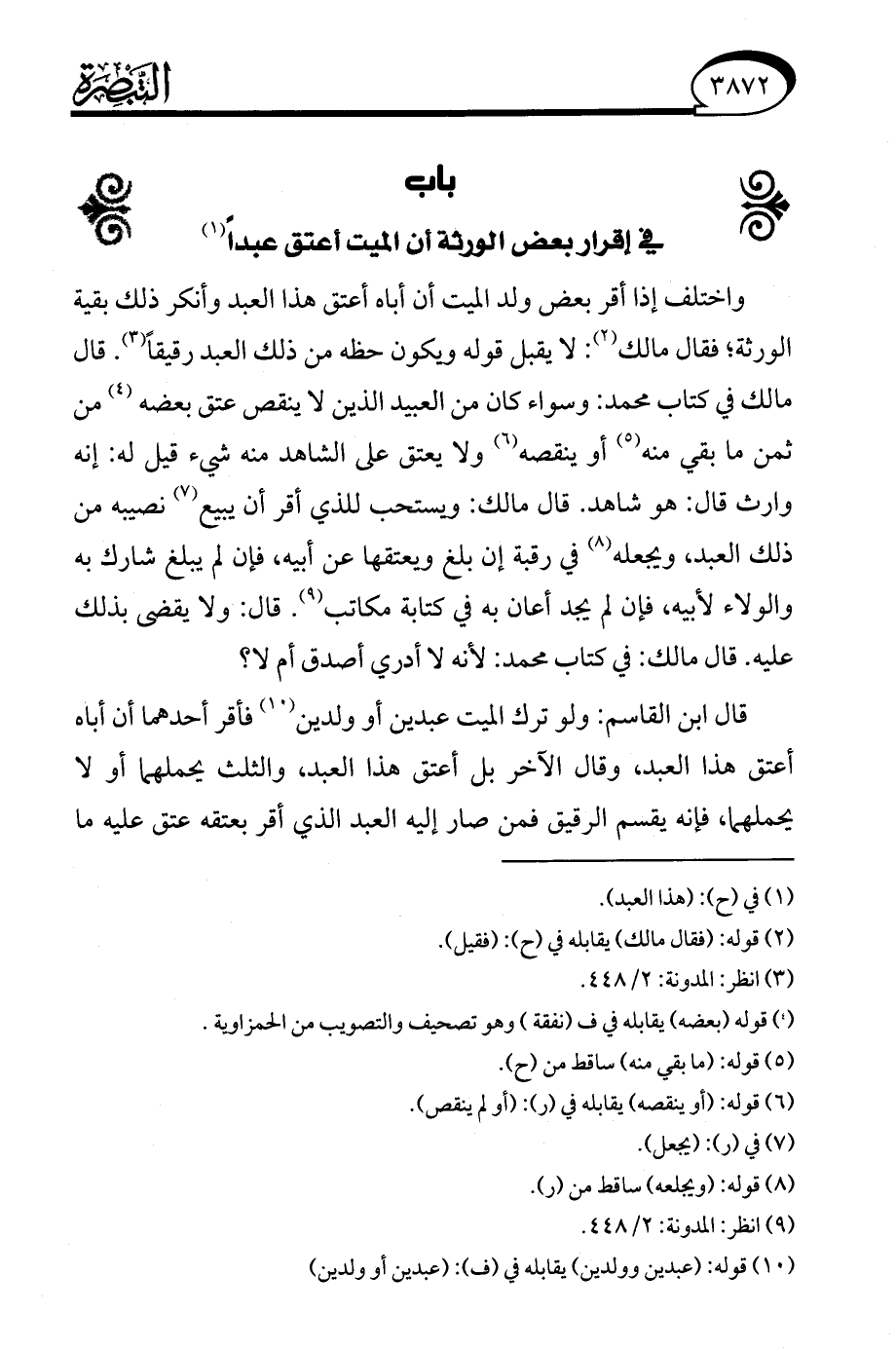 واختلف إذا أقر بعض ولد الميت أن أباه أعتق هذا العبد وأنكر ذلك بقية الورثة، فقال مالك (¬2): لا يقبل قوله ويكون حظه من ذلك العبد رقيقًا (¬3). قال مالك في كتاب محمد: وسواء كان من العبيد الذين لا ينقص عتق بعضه (¬4) من ثمن ما بقي منه (¬5) أو ينقصه (¬6) ولا يعتق على الشاهد منه شيء قيل له: إنه وارث قال: هو شاهد. قال مالك: ويستحب للذي أقر أن يبيع (¬7) نصيبه من ذلك العبد، ويجعله (¬8) في رقبة إن بلغ ويعتقها عن أبيه، فإن لم يبلغ شارك به والولاء لأبيه، فإن لم يجد أعان به في كتابة مكاتب (¬9). قال: ولا يقضى بذلك عليه. قال مالك: في كتاب محمد: لأنه لا أدري أصدق أم لا؟