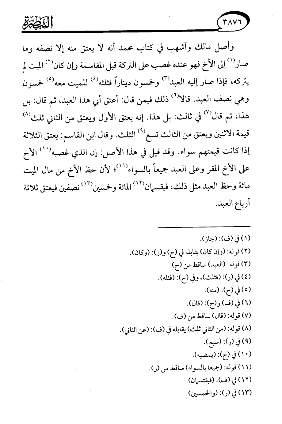 وأصل مالك وأشهب في كتاب محمد أنه لا يعتق منه إلا نصفه وما صار (¬1) إلى الأخ فهو عنده غصب على التركة قبل المقاسمة وإن كان (¬2) الميت لم يتركه، فإذا صار إليه العبد (¬3) وخمسون دينارًا فثلثه (¬4) للميت معه (¬5) خمسون وهي نصف العبد. قالا (¬6) ذلك فيمن قال: أعتق أبي هذا العبد، ثم قال: بل هذا، ثم قال (¬7) في ثالث: بل هذا. إنه يعتق الأول ويعتق من الثاني ثلث (¬8) قيمة الاثنين ويعتق من الثالث تسع (¬9) الثلث. وقال ابن القاسم: يعتق الثلاثة إذا كانت قيمتهم سواء. وقد قيل في هذا الأصل: إن الذي غصبه (¬10) الأخ على الأخ المقر وعلى العبد جميعًا بالسواء (¬11)؛ لأن حظ الأخ من مال الميت مائة وحظ العبد مثل ذلك، فيقسمان (¬12) المائة وخمسين (¬13) نصفين فيعتق ثلاثة أرباع العبد.