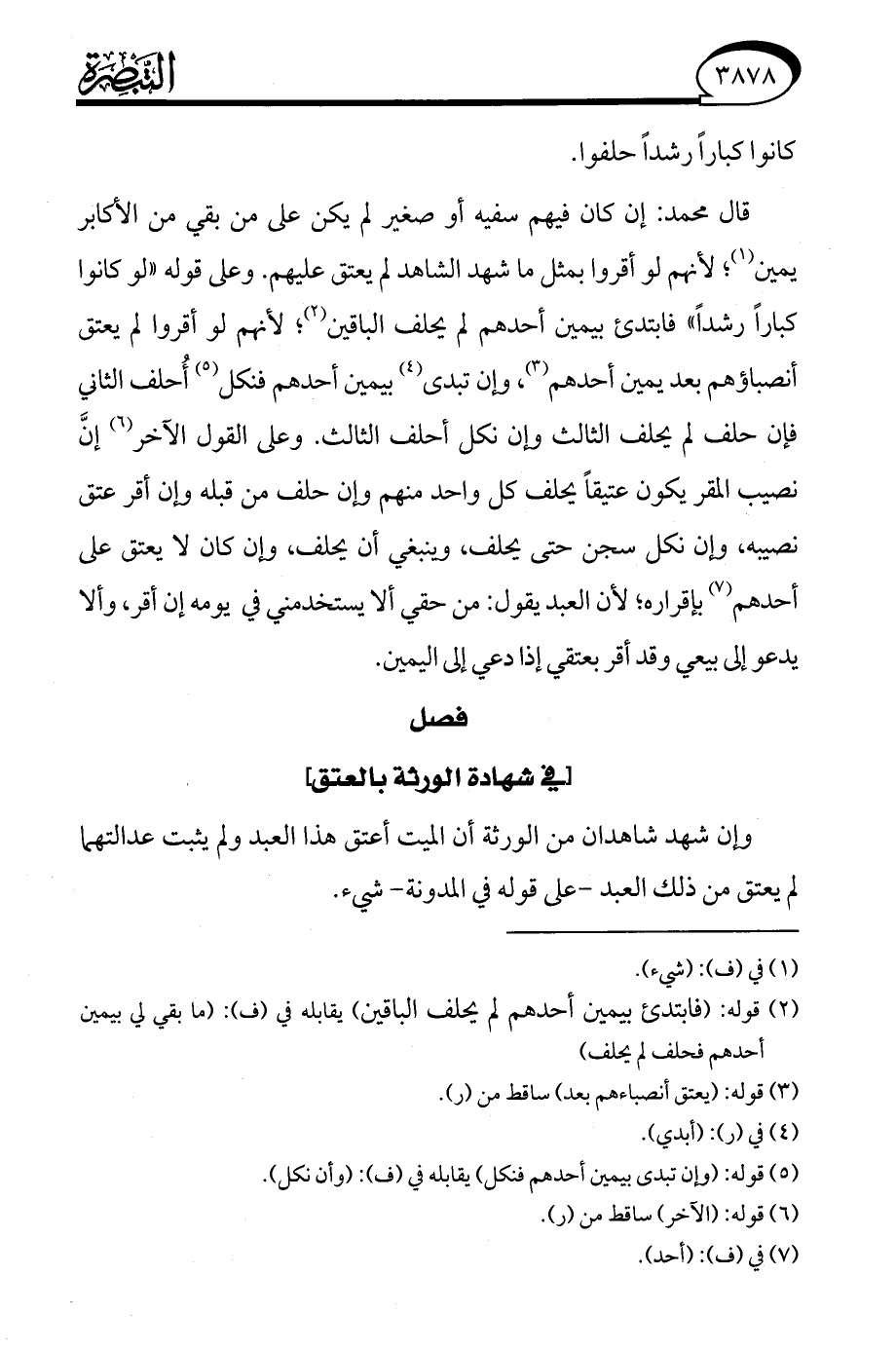قال محمد: إن كان فيهم سفيه أو صغير لم يكن على من بقي من الأكابر يمين (¬1)؛ لأنهم لو أقروا بمثل ما شهد الشاهد لم يعتق عليهم. وعلى قوله "لو كانوا كبارًا رشدًا" فابتدئ بيمين أحدهم لم يحلف الباقين (¬2)؛ لأنهم لو أقروا لم يعتق أنصباؤهم بعد يمين أحدهم (¬3)، وإن تبدى (¬4) بيمين أحدهم فنكل (¬5) أُحلف الثاني فإن حلف لم يحلف الثالث وإن نكل أحلف الثالث. وعلى القول الآخر (¬6) إنَّ نصيب المقر يكون عتيقًا يحلف كل واحد منهم وإن حلف من قبله وإن أقر عتق نصيبه، وإن نكل سجن حتى يحلف، وينبغي أن يحلف، وإن كان لا يعتق على أحدهم (¬7) بإقراره؛ لأن العبد يقول: من حقي ألا يستخدمني في يومه إن أقر، وألا يدعو إلى بيعي وقد أقر بعتقي إذا دعي إلى اليمين.