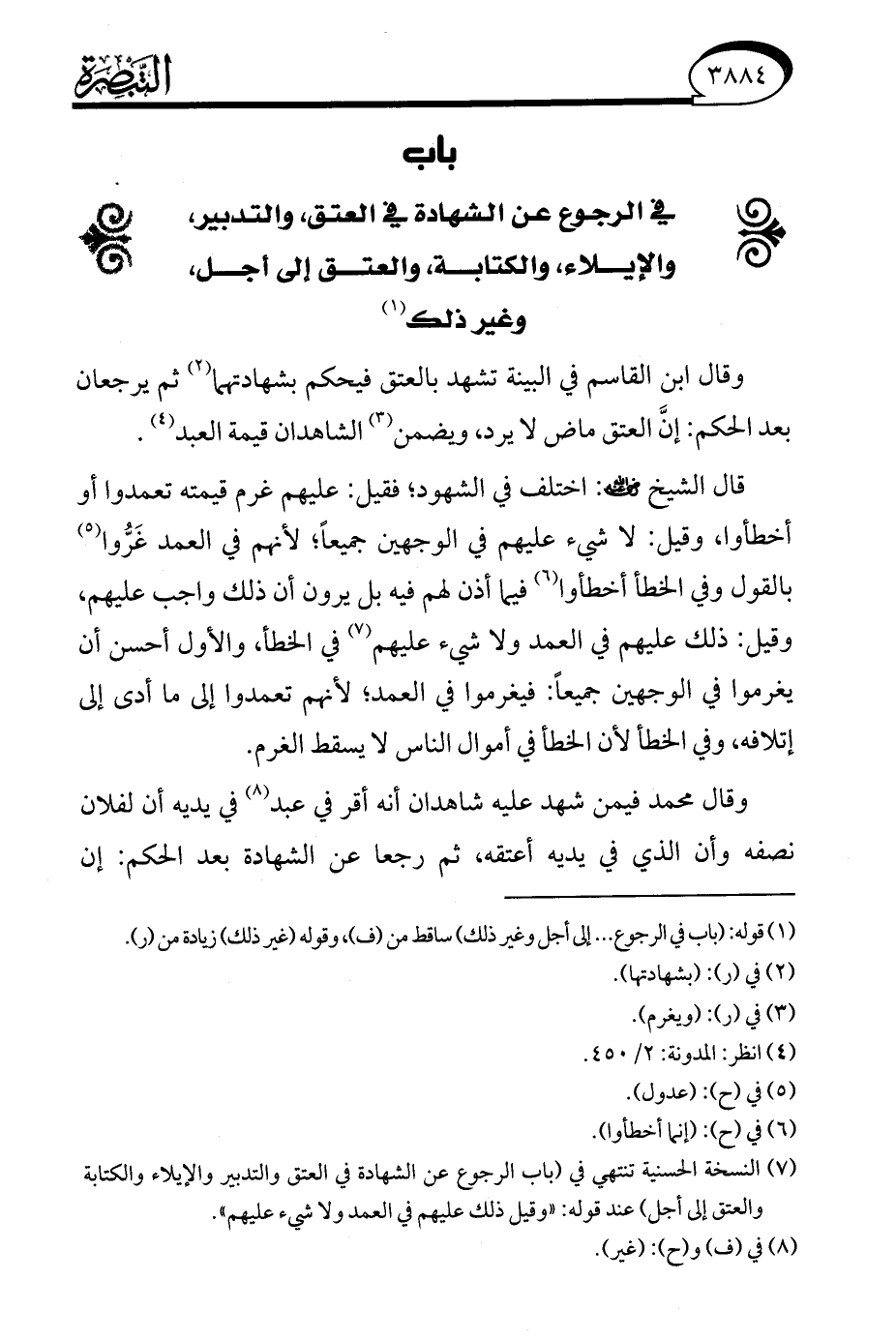 (¬7) النسخة الحسنية تنتهي في (باب الرجوع عن الشهادة في العتق والتدبير والإيلاء والكتابة والعتق إلى أجل) عند قوله: "وقيل ذلك عليهم في العمد ولا شيء عليهم".