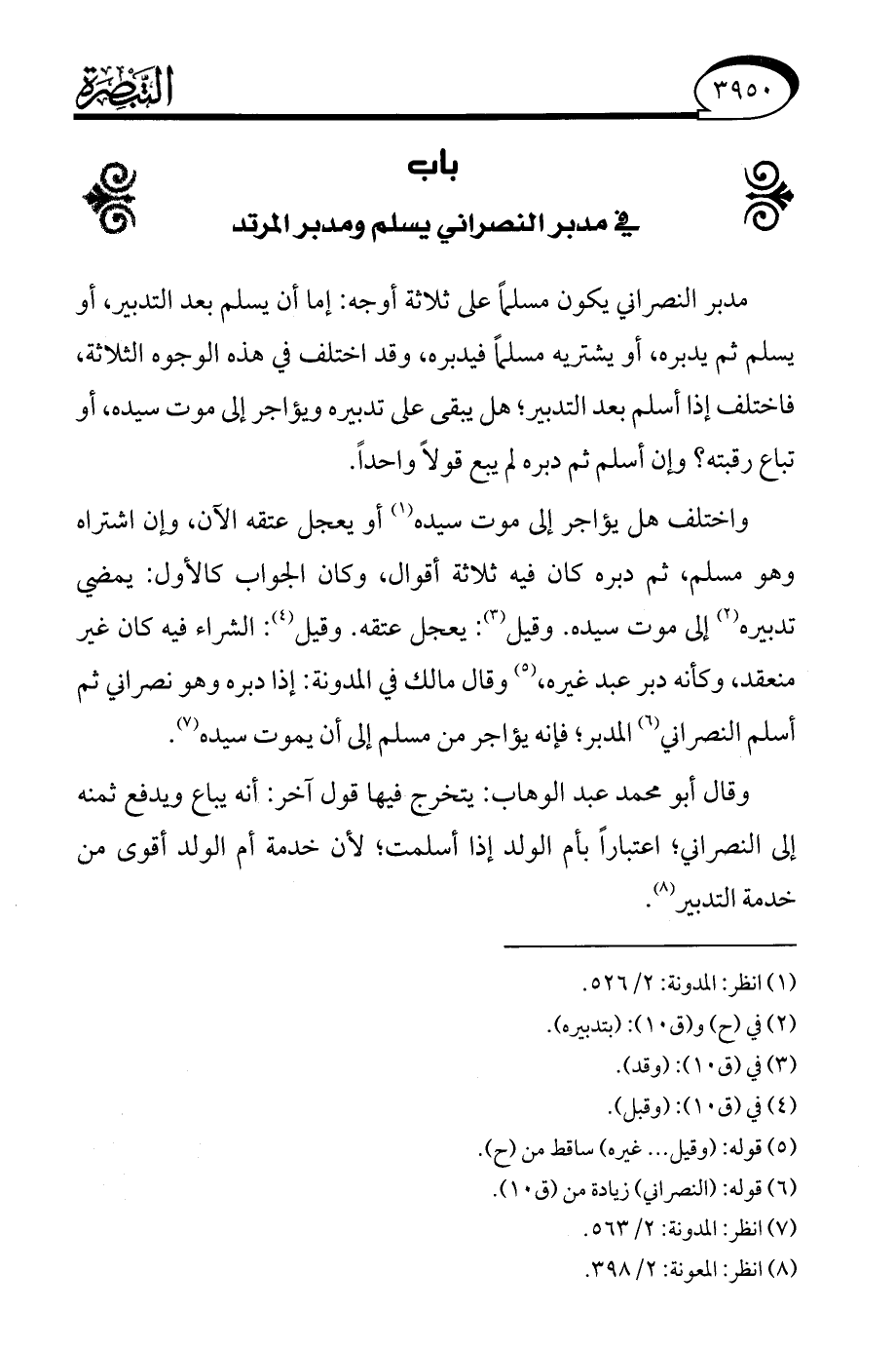 وقال أبو محمد عبد الوهاب: يتخرج فيها قول آخر: أنه يباع ويدفع ثمنه إلى النصراني؛ اعتبارًا بأم الولد إذا أسلمت؛ لأن خدمة أم الولد أقوى من خدمة التدبير (¬8).