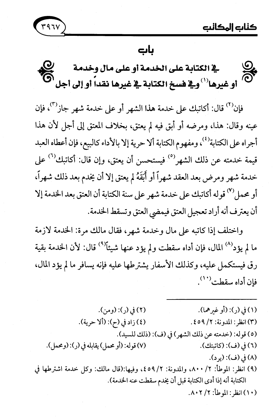 (¬9) انظر: الموطأ: 2/ 800، والمدونة: 2/ 459، وفيها: (قال مالك: وكل خدمة اشترطها في الكتابة أنه إذا أدى الكتابة قبل أن يخدم سقطت عنه الخدمة).