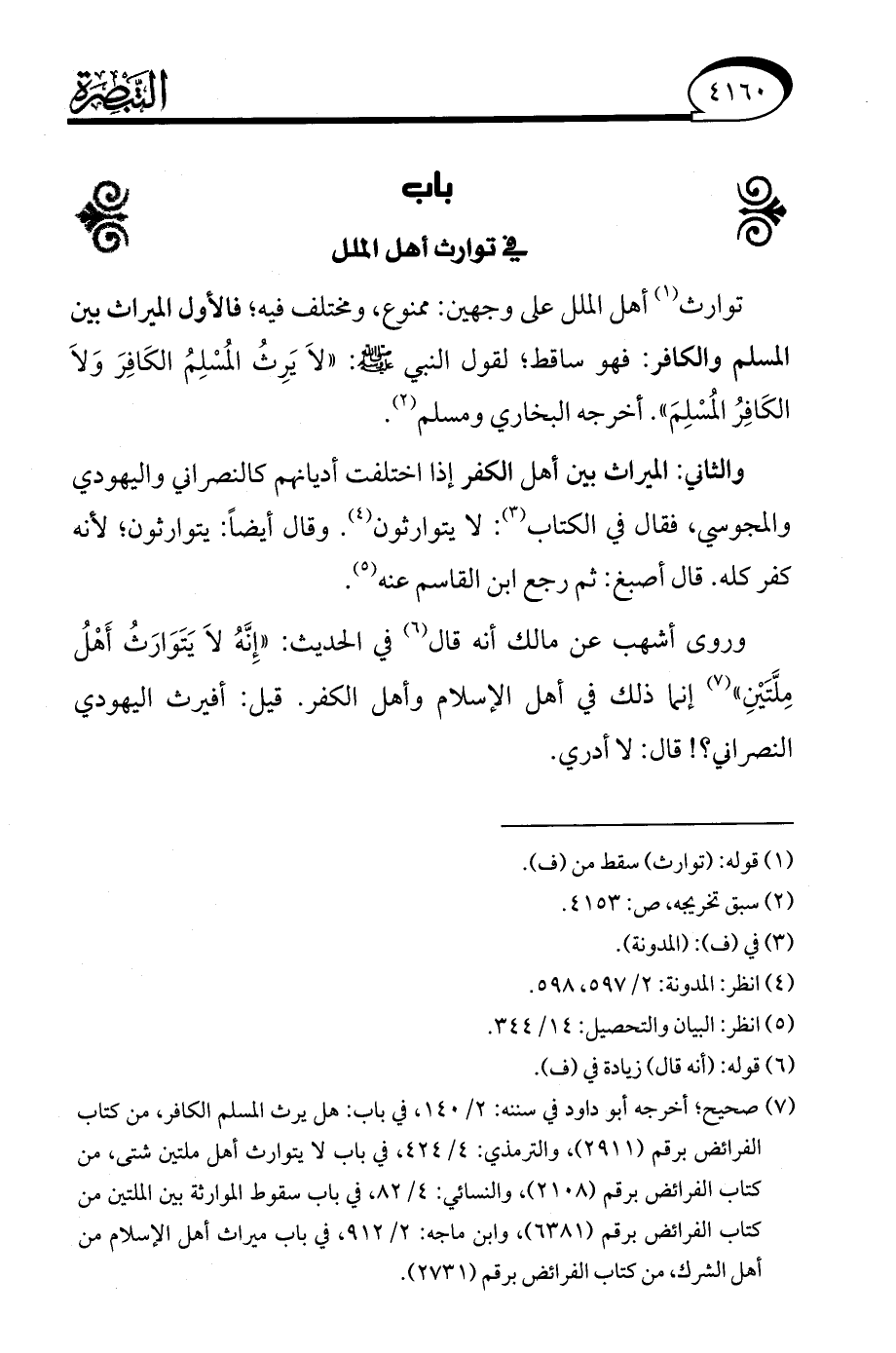 توارث (¬1) أهل الملل على وجهين: ممنوع، ومختلف فيه، فالأول الميراث بين المسلم والكافر: فهو ساقط، لقول النبي - صلى الله عليه وسلم -: "لا يَرِثُ المُسْلِمُ الكَافِرَ وَلاَ الكَافِرُ المُسْلِمَ ". أخرجه البخاري ومسلم (¬2).
