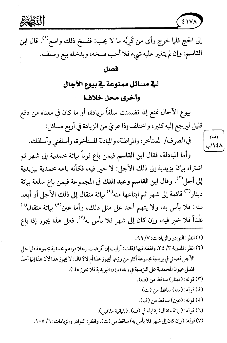 (¬7) قوله: (وإن كان بلى شهر فلا بأس به) ساقط من (ت). وانظر: النوادر والزيادات: 6/ 105.