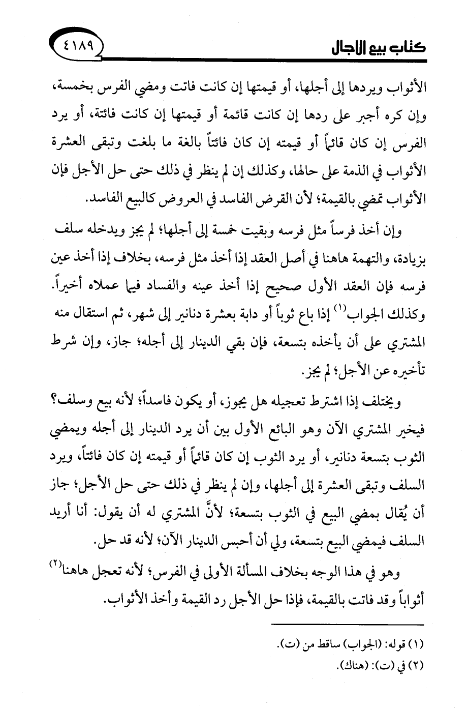 وهو في هذا الوجه بخلاف المسألة الأولى في الفرس؛ لأنه تعجل ها هنا (¬2) أثوابًا وقد فأتت بالقيمة، فإذا حل الأجل رد القيمة وأخذ الأثواب.