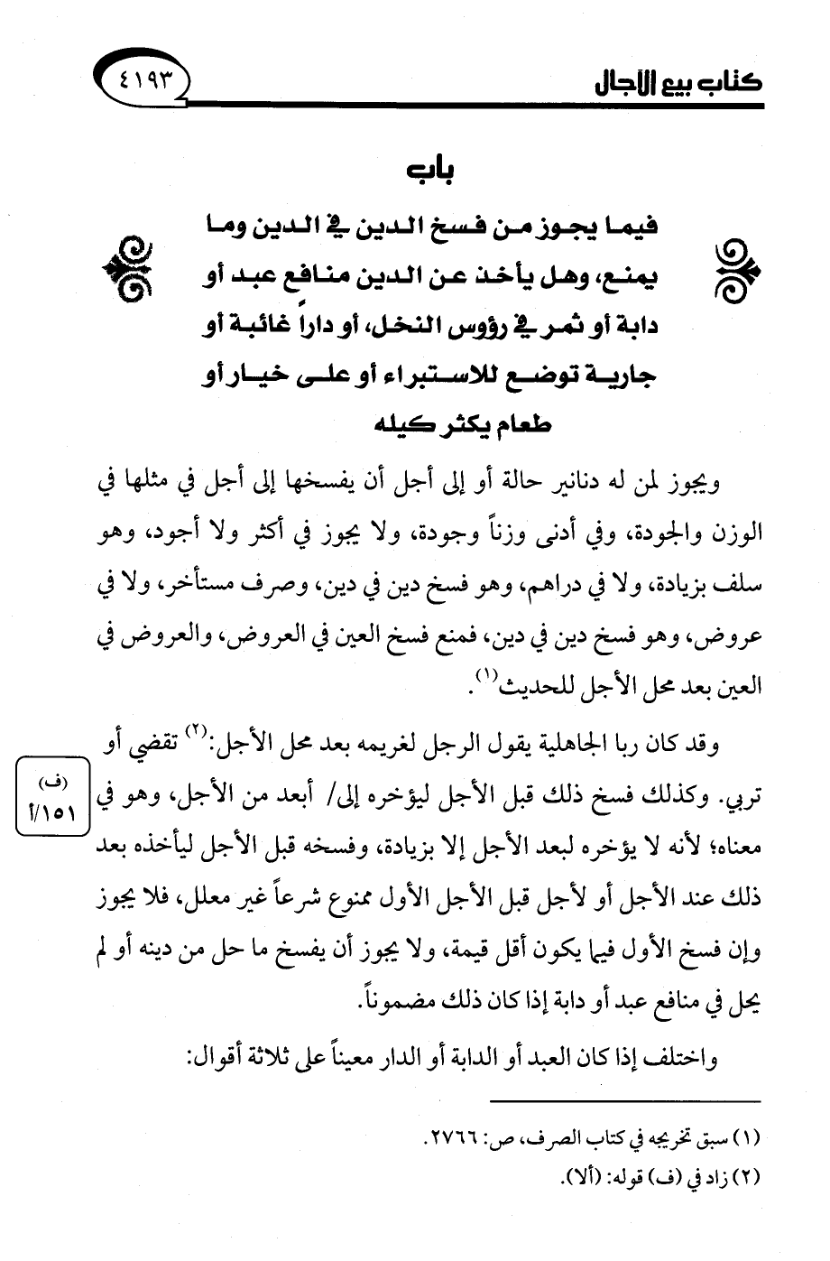 باب فيما يجوز من فسخ الدين في الدين وما يمنع، وهل يأخذ عن الدين منافع عبد أو دابة أو ثمر فى رؤوس النخل، أو دارًا غائبة أو جارية توضع للاستبراء أو على خيار أو طعام يكثر كيله