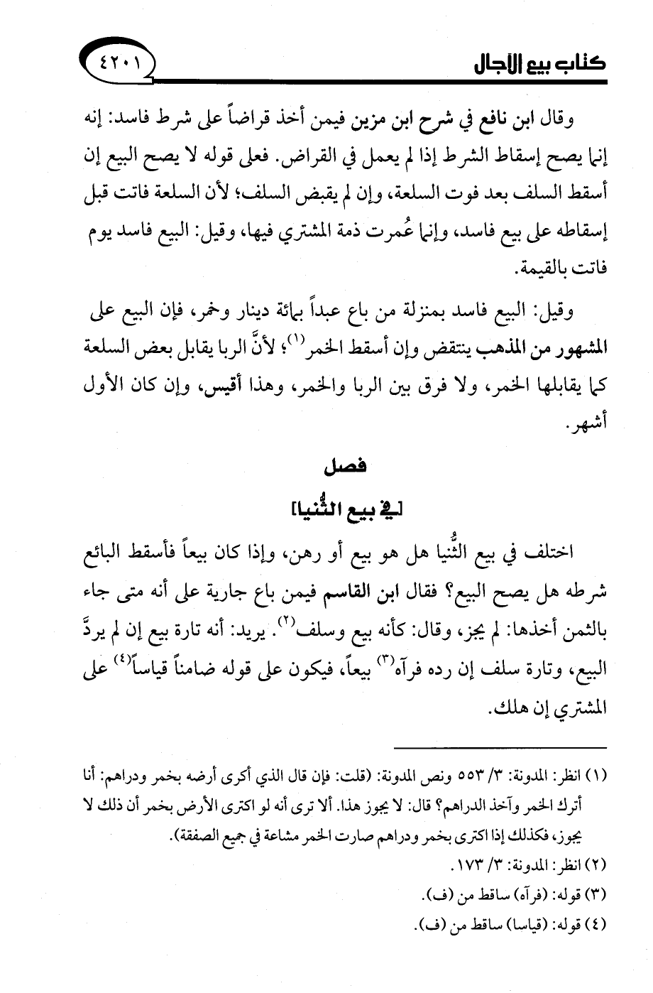 اختلف في بيع الثُّنيا هل هو بيع أو رهن، وإذا كان بيعًا فأسقط البائع شرطه هل يصح البيع؟ فقال ابن القاسم فيمن باع جارية على أنه متى جاء بالثمن أخذها: لم يجز، وقال: كأنه بيع وسلف (¬2). يريد: أنه تارة بيع إن لم يردَّ البيع، وتارة سلف إن رده فرآه (¬3) بيعًا، فيكون على قوله ضامنًا قياسًا (¬4) على المشتري إن هلك.