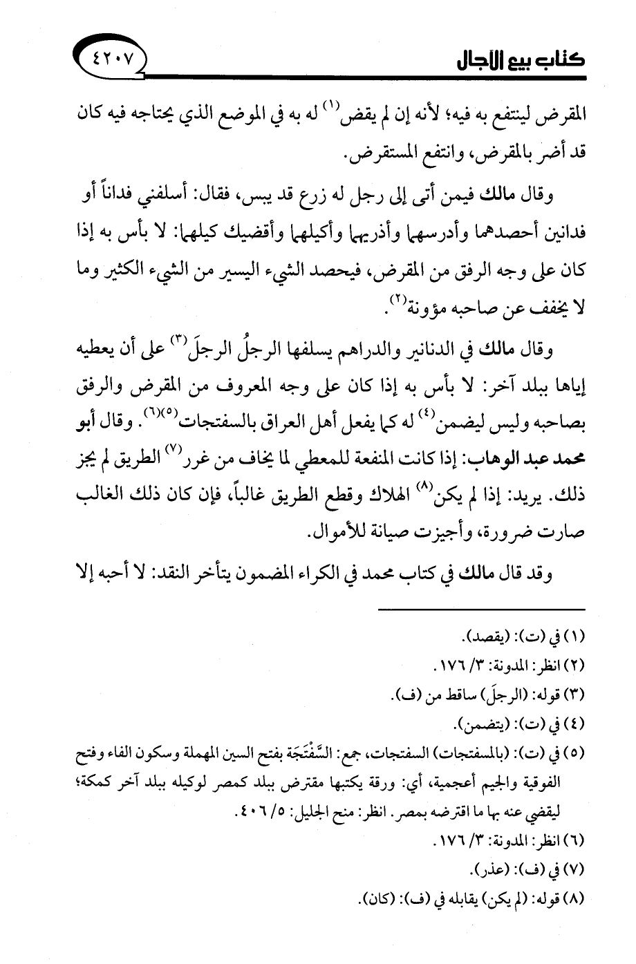 (¬5) في (ت): (بالمسفتجات) السفتجات، جمع: السَّفْتَجَة بفتح السين المهملة وسكون الفاء وفتح الفوقية والجيم أعجمية، أي: ورقة يكتبها مقترض ببلد كمصر لوكيله ببلد آخر كمكة، ليقضي عنه بها ما اقترضه بمصر. انظر: منح الجليل: 5/ 406.