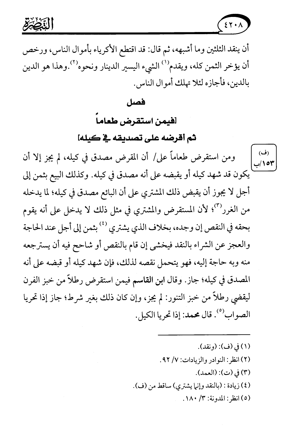 ومن استقرض طعامًا على أن المقرض مصدق في كيله، لم يجز إلا أن يكون قد شهد كيله أو يقبضه على أنه مصدق في كيله. وكذلك البيع بثمن إلى أجل لا يجوز أن يقبض ذلك المشتري على أن البائع مصدق في كيله، لما يدخله من الغرر (¬3)؛ لأن المستقرض والمشتري في مثل ذلك لا يدخل على أنه يقوم بحقه في النقص إن وجده، بخلاف الذي يشتري (¬4) بثمن إلى أجل عند الحاجة والعجز عن الشراء بالنقد فيخشى إن قام بالنقص أو شاحح فيه أن يسترجعه منه وبه حاجة إليه، فهو يتحمل نقصه لذلك، فإن شهد كيله أو قبضه على أنه المصدق في كيله، جاز. وقال ابن القاسم فيمن استقرض رطلًا من خبز الفرن ليقضي رطلًا من خبز التنور: لم يجز، وإن كان ذلك بغير شرط، جاز إذا تحريا الصواب (¬5). قال محمد: إذا تحريا الكيل.