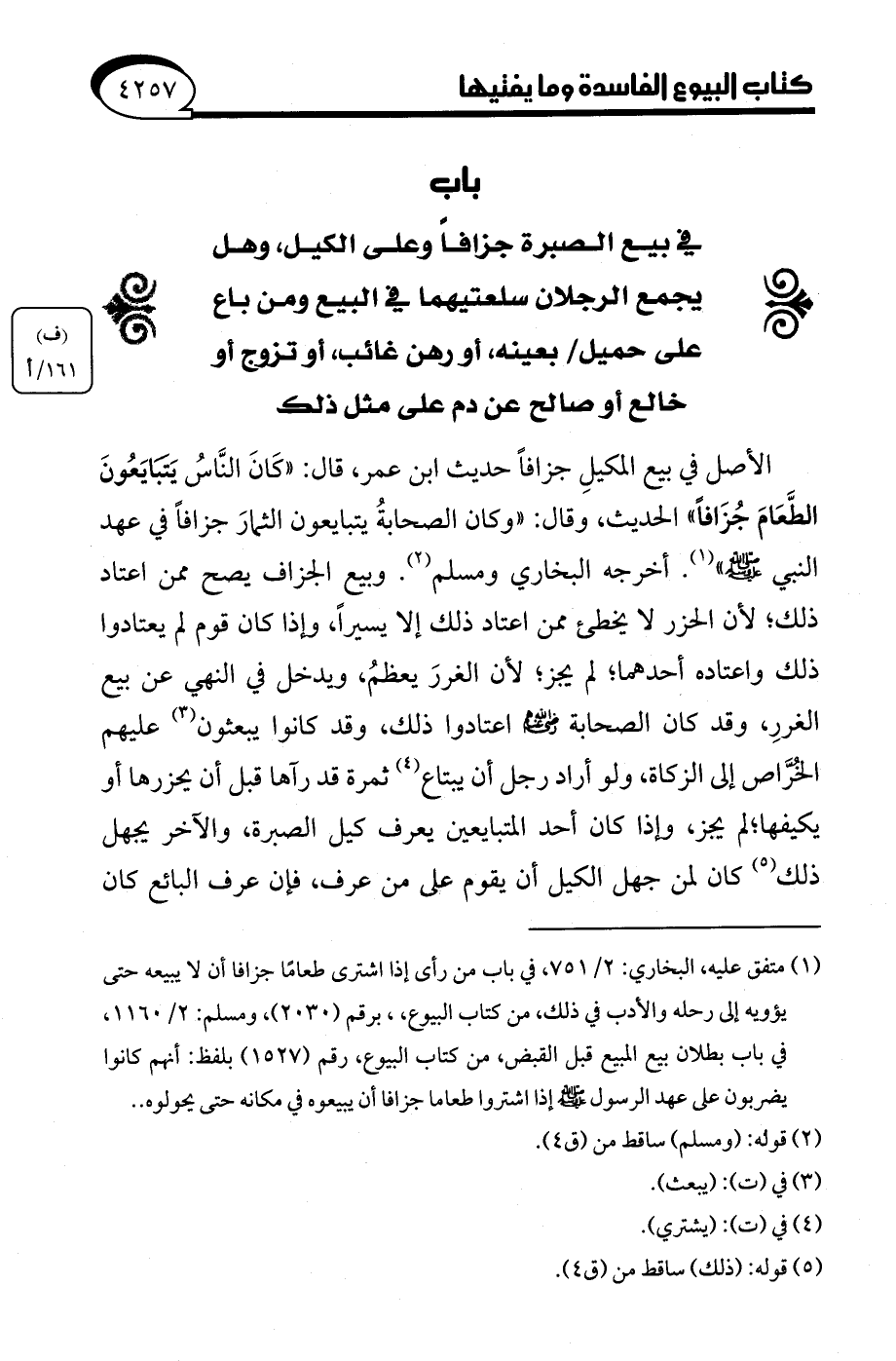 الأصل في بيع المكيلِ جزافًا حديث ابن عمر، قال: "كَانَ النَّاسُ يَتبَايَعُونَ الطَّعَامَ جُزَافًا" الحديث، وقال: "وكان الصحابةُ يتبايعون الثمارَ جزافًا في عهد النبي - صلى الله عليه وسلم -" (¬1). أخرجه البخاري ومسلم (¬2). وبيع الجزاف يصح ممن اعتاد ذلك؛ لأن الحزر لا يخطئ ممن اعتاد ذلك إلا يسيرًا، وإذا كان قوم لم يعتادوا ذلك واعتاده أحدهما، لم يجز؛ لأن الغررَ يعظمُ، ويدخل في النهي عن بيع الغررِ، وقد كان الصحابة - رضي الله عنهم - اعتادوا ذلك، وقد كانوا يبعثون (¬3) عليهم الخُرَّاص إلى الزكاة، ولو أراد رجل أن يبتاع (¬4) ثمرة قد رآها قبل أن يحزرها أو يكيفها؛ لم يجز، وإذا كان أحد المتبايعين يعرف كيل الصبرة، والآخر يجهل ذلك (¬5) كان لمن جهل الكيل أن يقوم على من عرف، فإن عرف البائع كان