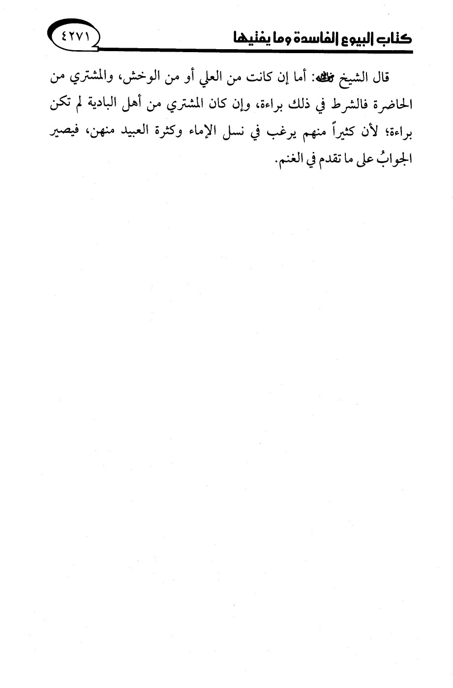 قال الشيخ - رضي الله عنه -: أما إن كانت من العلي أو من الوخش، والمشتري من الحاضرة فالشرط في ذلك براءة، وإن كان الشتري من أهل البادية لم تكن براءة؛ لأن كثيرًا منهم يرغب في نسل الإماء وكثرة العبيد منهن، فيصير الجوابُ على ما تقدم في الغنم.