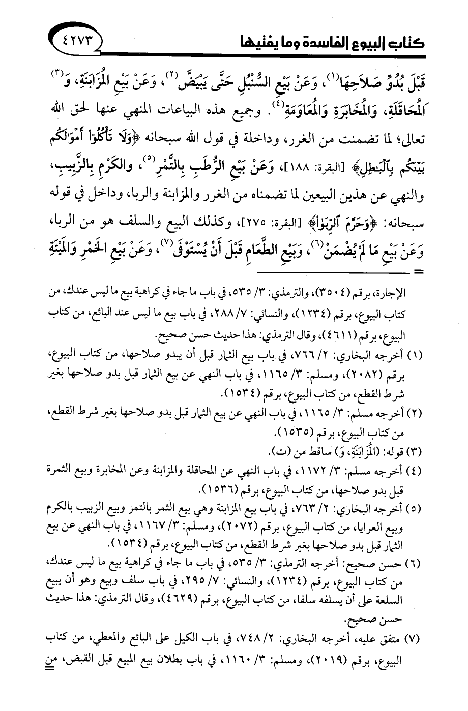 قَبْلَ بُدُوِّ صَلاَحِهَا (¬1)، وَعَنْ بَيْعِ السُّنْبُلِ حَتَّى يَبْيَضَّ (¬2)، وَعَنْ بَيْعِ المُزَابَنة وَ (¬3) المُحَاقَلَةِ، وَالمُخَابَرَةِ وَالمُعَاوَمَةِ (¬4). وجميع هذه البياعات المنهي عنها لحق الله تعالى، لما تضمنت من الغرر، وداخلة في قول الله سبحانه {وَلَا تَأْكُلُوا أَمْوَالَكُمْ بَيْنَكُمْ بِالْبَاطِلِ} [البقرة: 188]، وَعَنْ بَيْعِ الرُّطَبِ بِالتَّمْرِ (¬5)، والكَرْمِ بِالزَّبِيبِ، والنهي عن هذين البيعين لما تضمناه من الغرر والمزابنة والربا، وداخل في قوله سبحانه: {وَحَرَّمَ الرِّبَا} [البقرة: 275]، وكذلك البيع والسلف هو من الربا، وَعَنْ بَيْعِ مَا لَمْ يُضْمَنْ (¬6)، وَبَيْعِ الطَّعَامِ قَبْلَ أَنْ يُسْتَوْفَى (¬7)، وَعَنْ بَيع الخَمْرِ وَالمَيْتَةِ