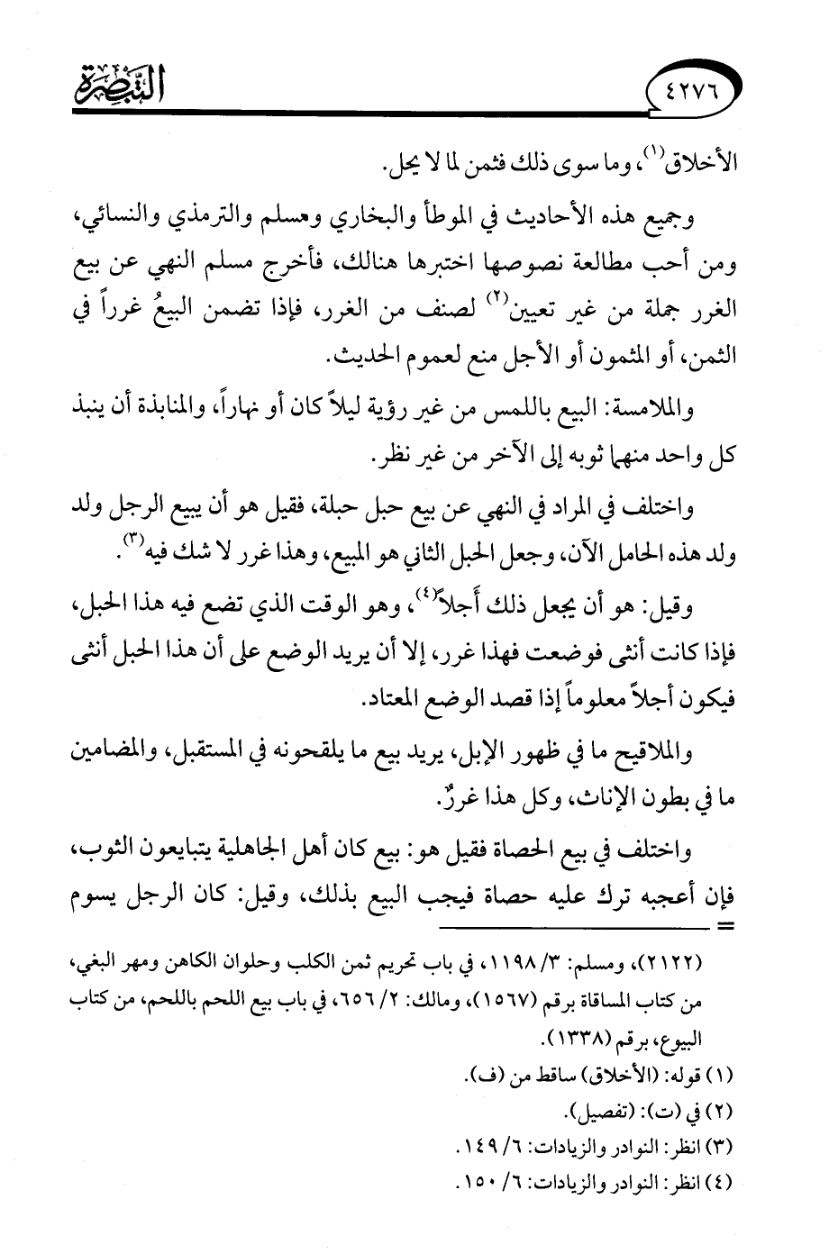 وجميع هذه الأحاديث في الموطأ والبخاري ومسلم والترمذي والنسائي، ومن أحب مطالعة نصوصها اختبرها هنالك، فأخرج مسلم النهي عن بيع الغرر جملة من غير تعيين (¬2) لصنف من الغرر، فإذا تضمن البيعُ غررًا في الثمن، أو المثمون أو الأجل منع لعموم الحديث.