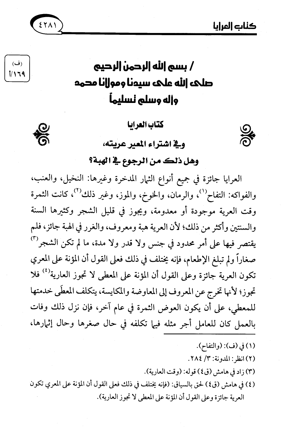 (¬4) في هامش (ق 4) لحق بالسياق: (فإنه يختلف في ذلك فعلى القول أن المؤنة على المعري تكون العرية جائزة وعلى القول أن المؤنة على المعطى لا تجوز العارية).