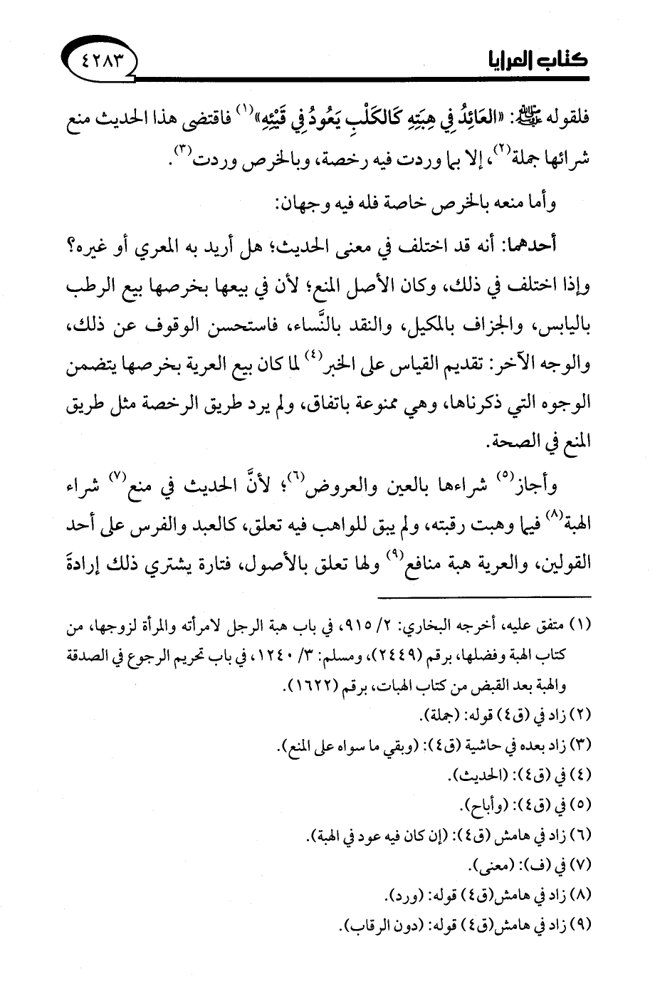 (¬1) متفق عليه، أخرجه البخاري: 2/ 915، في باب هبة الرجل لامرأته والمرأة لزوجها، من كتاب الهبة وفضلها، برقم (2449)، ومسلم: 3/ 1240، في باب تحريم الرجوع في الصدقة والهبة بعد القبض من كتاب الهبات، برقم (1622).