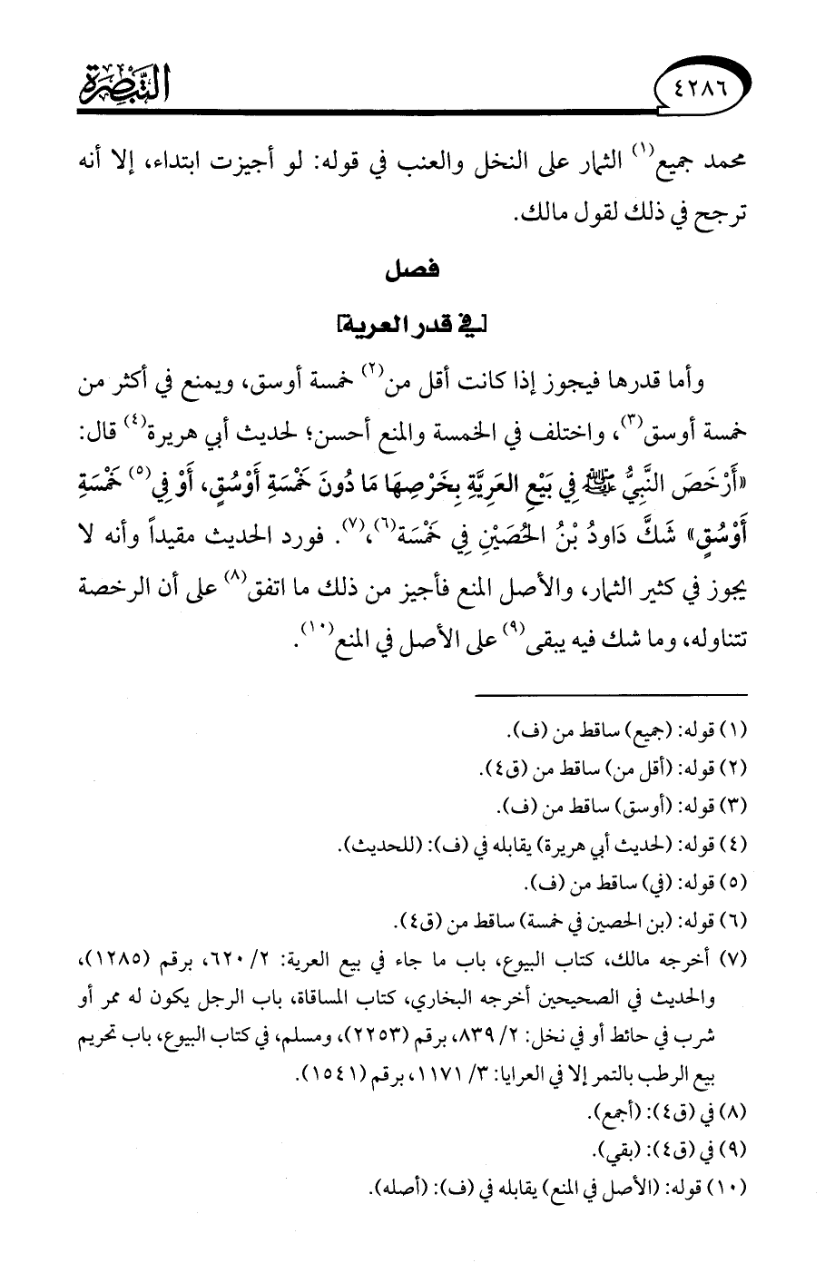 (¬7) أخرجه مالك، كتاب البيوع، باب ما جاء في بيع العرية: 2/ 620، برقم (1285)، والحديث في الصحيحين أخرجه البخاري، كتاب المساقاة، باب الرجل يكون له ممر أو شرب في حائط أو في نخل: 2/ 839، برقم (2253)، ومسلم، في كتاب البيوع، باب تحريم بيع الرطب بالتمر إلا في العرايا: 3/ 1171، برقم (1541).