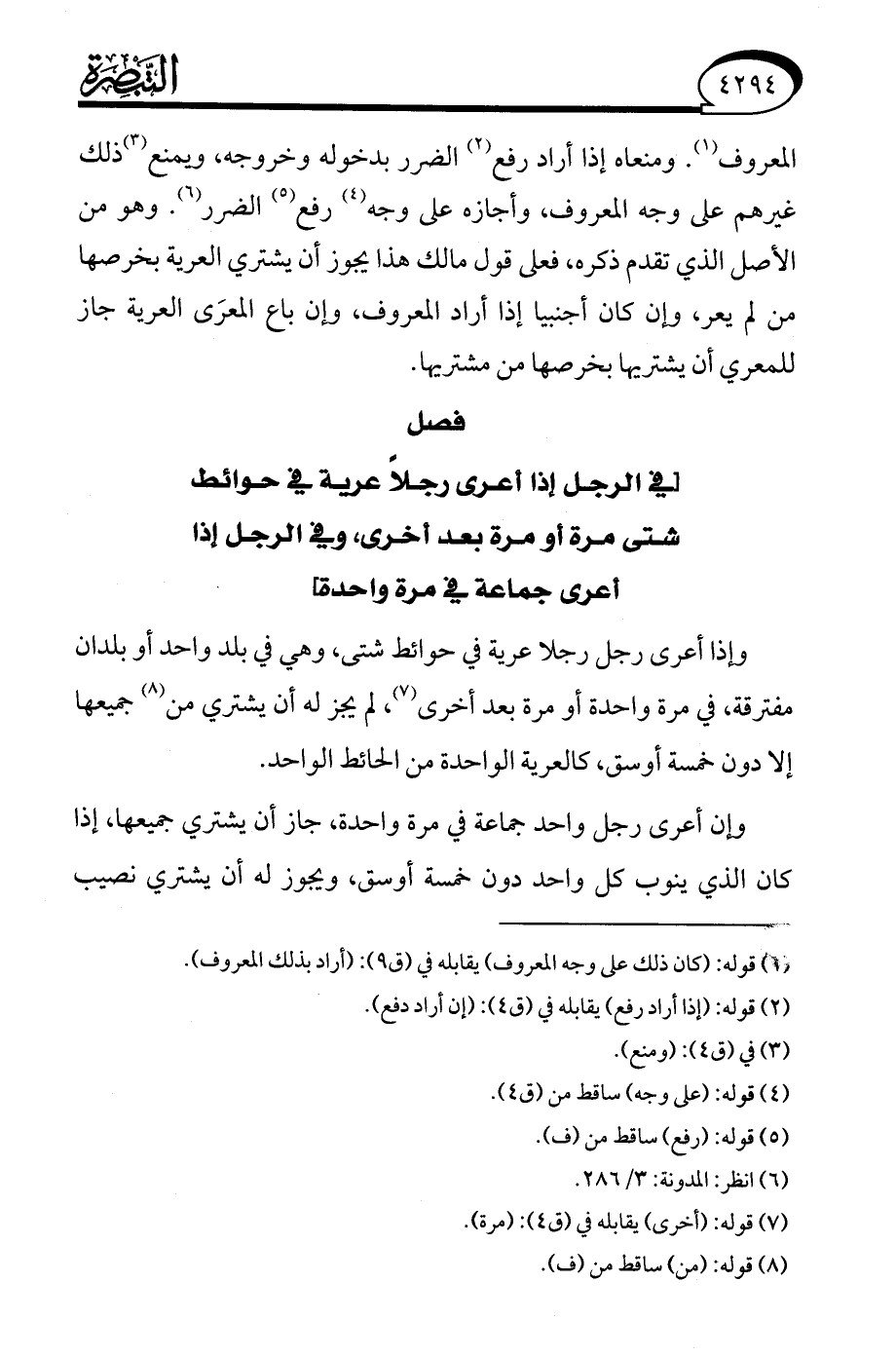 المعروف (¬1). ومنعاه إذا أراد رفع (¬2) الضرر بدخوله وخروجه، ويمنع (¬3) ذلك غيرهم على وجه المعروف، وأجازه على وجه (¬4) رفع (¬5) الضرر (¬6). وهو من الأصل الذي تقدم ذكره، فعلى قول مالك هذا يجوز أن يشتري العرية بخرصها من لم يعر، وإن كان أجنبيا إذا أراد المعروف، وإن باع المعرَى العرية جاز للمعري أن يشتريها بخرصها من مشتريها.
