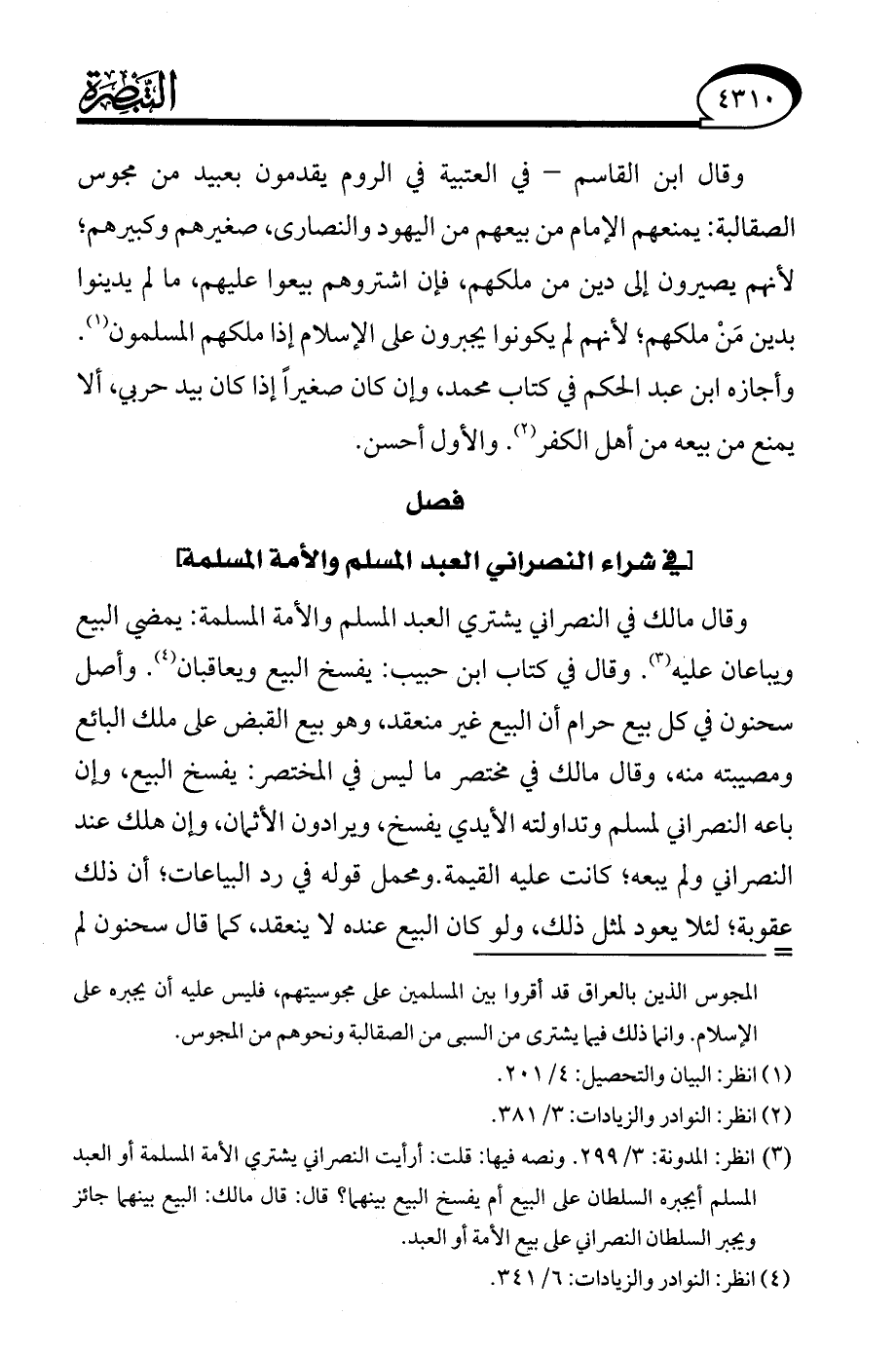 (¬3) انظر: المدونة: 3/ 299. ونصه فيها: قلت: أرأيت النصراني يشتري الأمة المسلمة أو العبد المسلم أيجبره السلطان على البيع أم يفسخ البيع بينهما؟ قال: قال مالك: البيع بينهما جائز ويجبر السلطان النصراني على بيع الأمة أو العبد.