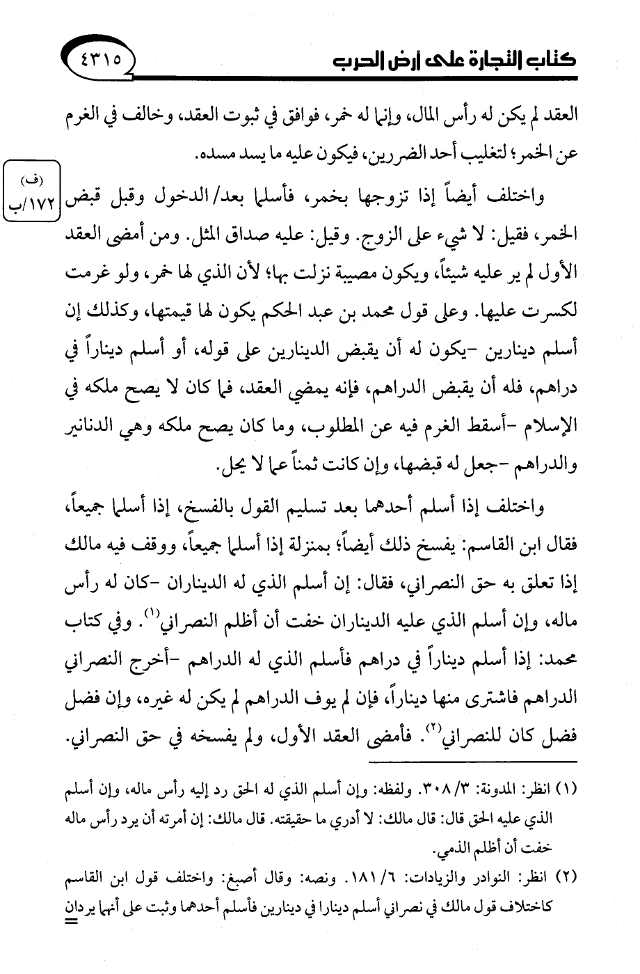 (¬2) انظر: النوادر والزيادات: 6/ 181. ونصه: وقال أصبغ: واختلف قول ابن القاسم كاختلاف قول مالك في نصراني أسلم دينارا في دينارين فأسلم أحدهما وثبت على أنهما يردان =