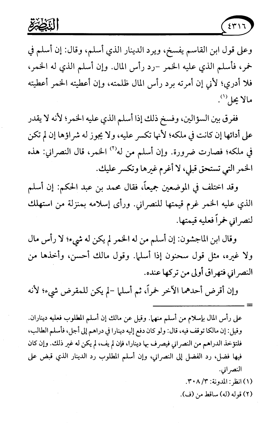 ففرق بين السؤالين، وفسخ ذلك إذا أسلم الذي عليه الخمر؛ لأنه لا يقدر على أدائها إن كانت في ملكه؛ لأنها تكسر عليه، ولا يجوز له شراؤها إن لم تكن في ملكه، فصارت ضرورة. وإن أسلم من له (¬2) الخمر، قال النصراني: هذه الخمر التي تستحق قبلي، لا أغرم غيرها وتكسر عليك.