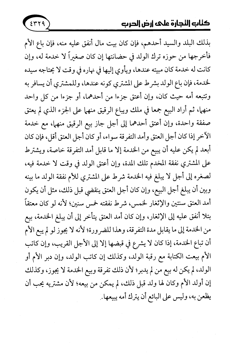 بذلك البلد والسيد أحدهم، فإن كان بيت مال أنفق عليه منه، فإن باع الأم فأخرجها من حوزه ترك الولد في حضانتها إن كان صغيرًا لا خدمة له، وإن كانت له خدمة كان مبيته عندها، ويأوي إليها في نهاره في وقت لا يحتاجه سيده لخدمة، فإن باع الولد بشرط على المشتري كونه عندها، وللمشتري أن يسافر به وتتبعه أمه حيث كان، وإن أعتق جزءا من أحدهما، أو جزءا من كل واحد منهما، ثم أراد البيع جمعا في ملك ويباع الرقيق منهما على الجزء الذي لم يعتق صفقة واحدة، كان أعتق أحدهما إلى أجل جاز بيع الرقيق منهما، مع خدمة الآخر إذا كان أجل العتق وأمد التفرقة سواء، أو كان أجل العتق أقل، فإن كان أبعد لم يكن عليه أن يبيع من الخدمة إلا ما قابل أمد التفرقة خاصة، ويشترط على المشتري نفقة المخدم تلك المدة، كان أعتق الولد في وقت لا خدمة فيه، لصغره إلى أجل لا يبلغ فيه الخدمة شرط على المشتري للأم نفقة الولد ما بينه وبين أن يبلغ أجل البيع، وإن كان أجل العتق ينقضي قبل ذلك، مثل أن يكون أمد العتق سنتين والإثغار لخمس، شرط نفقته خمس سنين؛ لأنه لو كان معتقًا بتلا أنفق عليه إلى الإثغار، وإن كان أمد العتق يتأخر إلى أن يبلغ الخدمة، بيع من الخدمة إلى ما يقابل مدة التفرقة وهذا للضرورة؛ لأنه لا يجوز لو لم يبع الأم أن تباع الخدمة، إذا كان لا يشرع في قبضها إلا إلى الأجل القريب، وإن كاتب الأم بيعت الكتابة مع رقبة الولد، وكذلك إن كاتب الولد، وإن دبر الأم أو الولد، لم يكن له بيع من لم يدبر؛ لأن ذلك تفرقة وبيع الخدمة لا يجوز، وكذلك إن أولد الأم وكان لها ولد قبل ذلك، لم يمكن من بيعه؛ لأن مشتريه يحب أن يظعن به، وليس على البائع أن يترك أمه يبيعها.