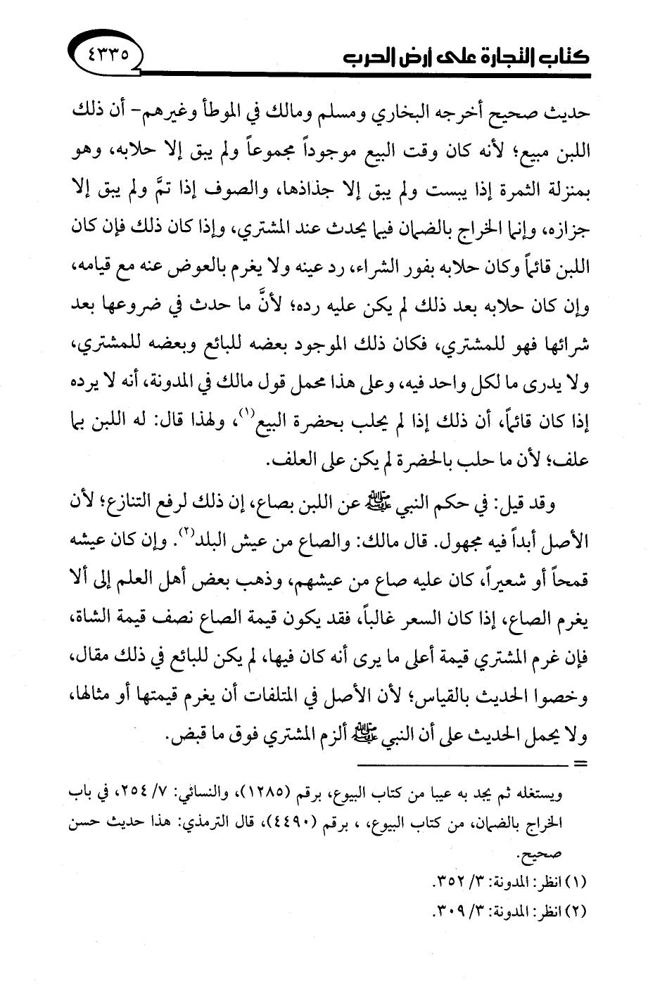 حديث صحيح أخرجه البخاري ومسلم ومالك في الموطأ وغيرهم- أن ذلك اللبن مبيع؛ لأنه كان وقت البيع موجودًا مجموعًا ولم يبق إلا حلابه، وهو بمنزلة الثمرة إذا يبست ولم يبق إلا جذاذها، والصوف إذا تمَّ ولم يبق إلا جزازه، وإنما الخراج بالضمان فيما يحدث عند المشتري، وإذا كان ذلك فإن كان اللبن قائمًا وكان حلابه بفور الشراء، رد عينه ولا يغرم بالعوض عنه مع قيامه، وإن كان حلابه بعد ذلك لم يكن عليه رده؛ لأنَّ ما حدث في ضروعها بعد شرائها فهو للمشتري، فكان ذلك الموجود بعضه للبائع وبعضه للمشتري، ولا يدرى ما لكل واحد فيه، وعلى هذأ محمل قول مالك في المدونة، أنه لا يرده إذا كان قائمًا، أن ذلك إذا لم يحلب بحضرة البيع (¬1)، ولهذا قال: له اللبن بما علف؛ لأن ما حلب بالحضرة لم يكن على العلف.