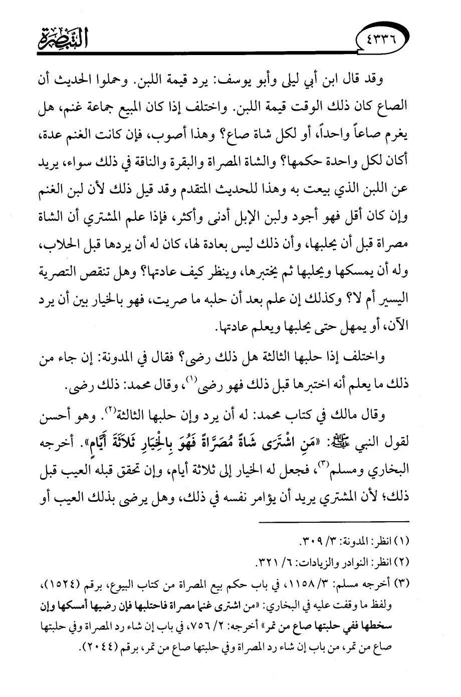 (¬3) أخرجه مسلم: 3/ 1158، في باب حكم بيع المصراة من كتاب البيوع، برقم (1524)، ولفظ ما وقفت عليه في البخاري: "من اشترى غنما مصراة فاحتلبها فإن رضيها أمسكها وإن سخطها ففي حلبتها صالح من تمر" أخرجه: 2/ 756، في باب إن شاء رد المصراة وفي حلبتها صالح من تمر، من باب إن شاء رد المصراة وفي حلبتها صالح من تمر، برقم (2044).