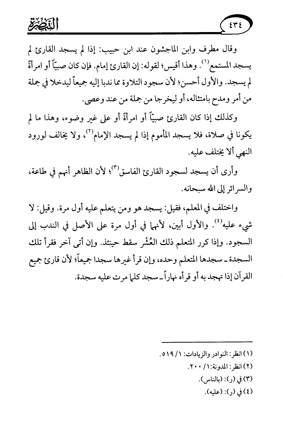 وقال مطرف وابن الماجشون عند ابن حبيب: إذا لم يسجد القارئ لم يسجد المستمع (¬1). وهذا أقيس؛ لقوله: إن القارئ إمام. فإن كان صبيًّا أو امرأةً لم يسجد. والأول أحسن؛ لأن سجود التلاوة مما ندبا إليه جميعًا ليدخلا في جملة من أمر ومدح بامتثاله، أو ليخرجا من جملة من عند وعصى.
