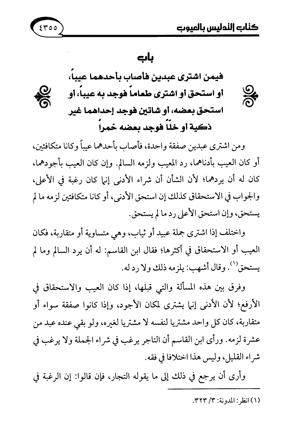 ومن اشترى عبدين صفقة واحدة، فأصاب بأحدهما عيبًا وكانا متكافئين، أو كان العيب بأدناهما، رد المعيب ولزمه السالم. وإن كان العيب بأجودهما، كان له أن يردهما؛ لأن الشأن أن شراء الأدنى إنما كان رغبة في الأعلى، والجواب في الاستحقاق كذلك إن استحق الأدنى، أو كانا متكافئين لزمه ما لم يستحق، وإن استحق الأعلى رد ما لم يستحق.