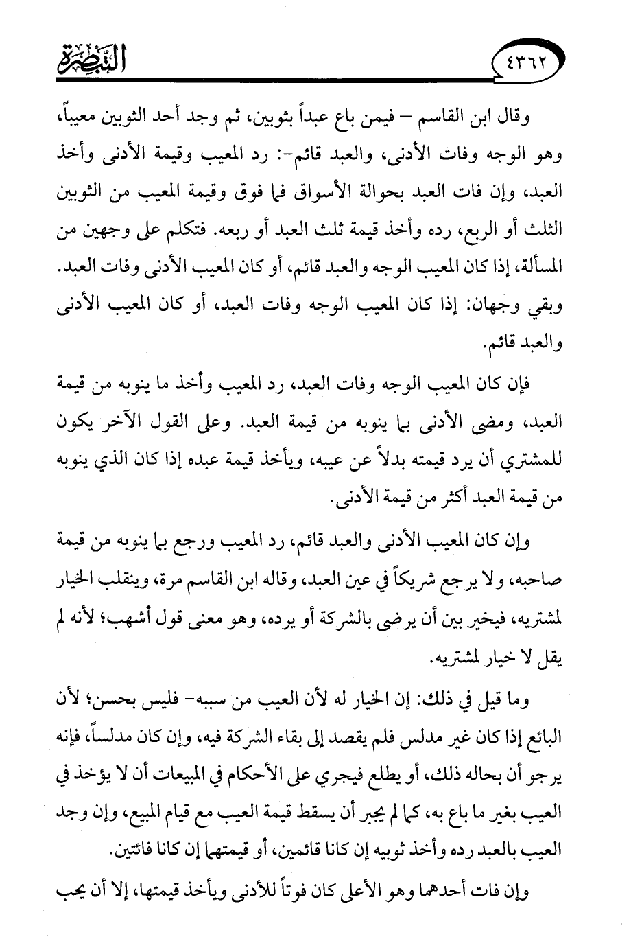 وما قيل في ذلك: إن الخيار له لأن العيب من سببه- فليس بحسن؛ لأن البائع إذا كان غير مدلس فلم يقصد إلى بقاء الشركة فيه، وإن كان مدلسًا، فإنه يرجو أن بحاله ذلك، أو يطلع فيجري على الأحكام في المبيعات أن لا يؤخذ في العيب بغير ما باع به، كما لم يجبر أن يسقط قيمة العيب مع قيام المبيع، وإن وجد العيب بالعبد رده وأخذ ثوبيه إن كانا قائمين، أو قيمتهما إن كانا فائتين.