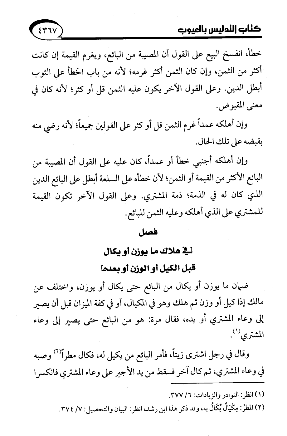 ضمان ما يوزن أو يكال من البائع حتى يكال أو يوزن، واختلف عن مالك إذا كيل أو وزن ثم هلك وهو في المكيال، أو في كفة الميزان قبل أن يصير إلى وعاء المشتري أو يده، فقال مرة: هو من البائع حتى يصير إلى وعاء المشتري (¬1).