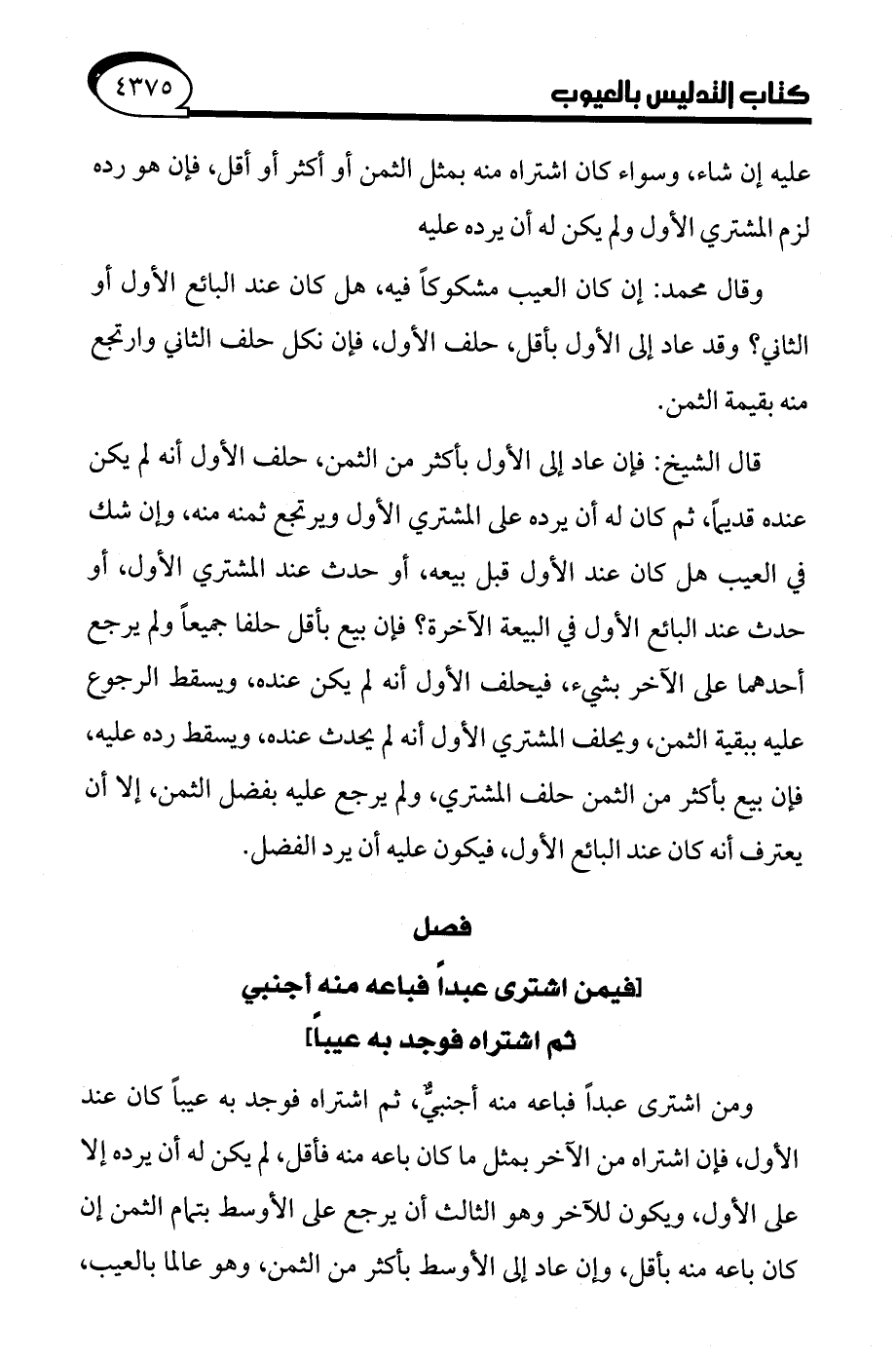 قال الشيخ: فإن عاد إلى الأول بأكثر من الثمن، حلف الأول أنه لم يكن عنده قديمًا، ثم كان له أن يرده على المشتري الأول ويرتجع ثمنه منه، وإن شك في العيب هل كان عند الأول قبل بيعه، أو حدث عند المشتري الأول، أو حدث عند البائع الأول في البيعة الآخرة؟ فإن بيع بأقل حلفا جميعًا ولم يرجع أحدهما على الآخر بشيء، فيحلف الأول أنه لم يكن عنده، ويسقط الرجوع عليه ببقية الثمن، ويحلف المشتري الأول أنه لم يحدث عنده، ويسقط رده عليه، فإن بيع بأكثر من الثمن حلف المشتري، ولم يرجع عليه بفضل الثمن، إلا أن يعترف أنه كان عند البائع الأول، فيكون عليه أن يرد الفضل.