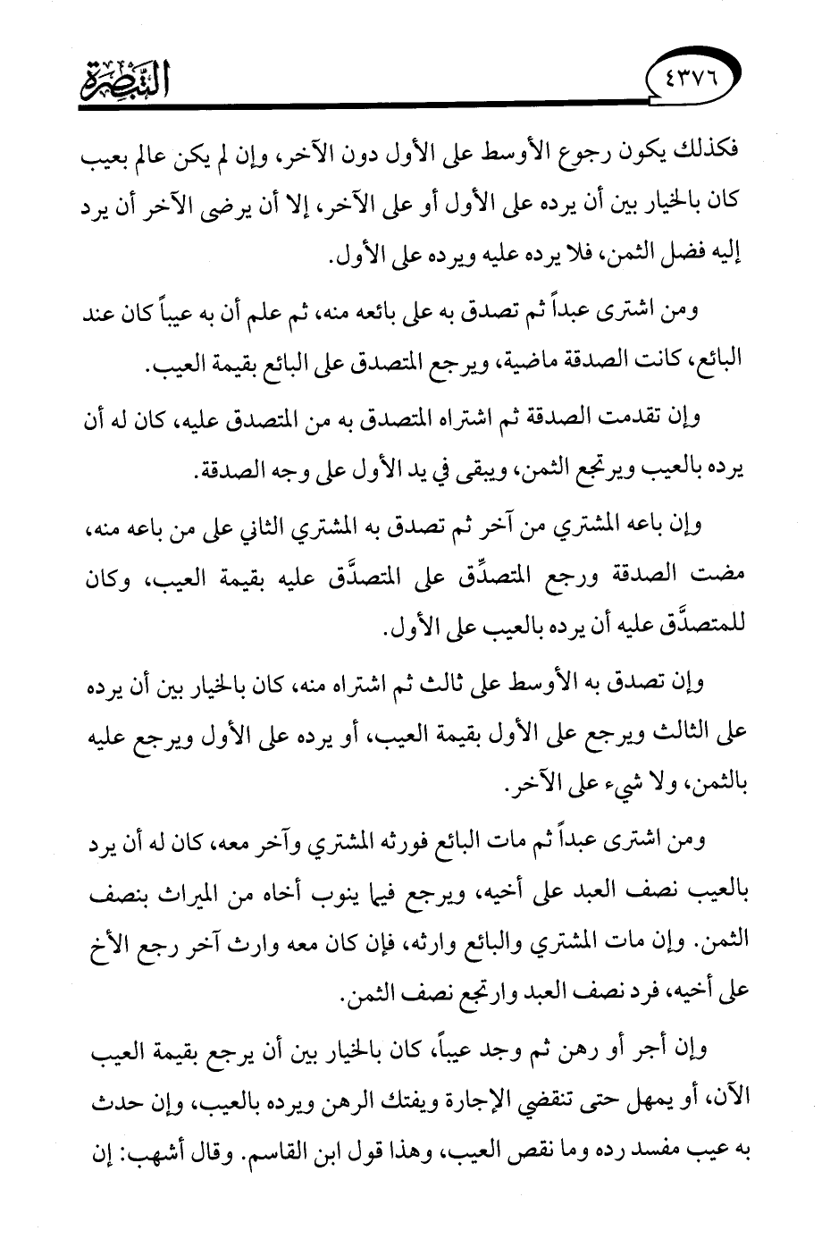 ومن اشترى عبدًا ثم تصدق به على بائعه منه، ثم علم أن به عيبًا كان عند البائع، كانت الصدقة ماضية، ويرجع المتصدق على البائع بقيمة العيب.