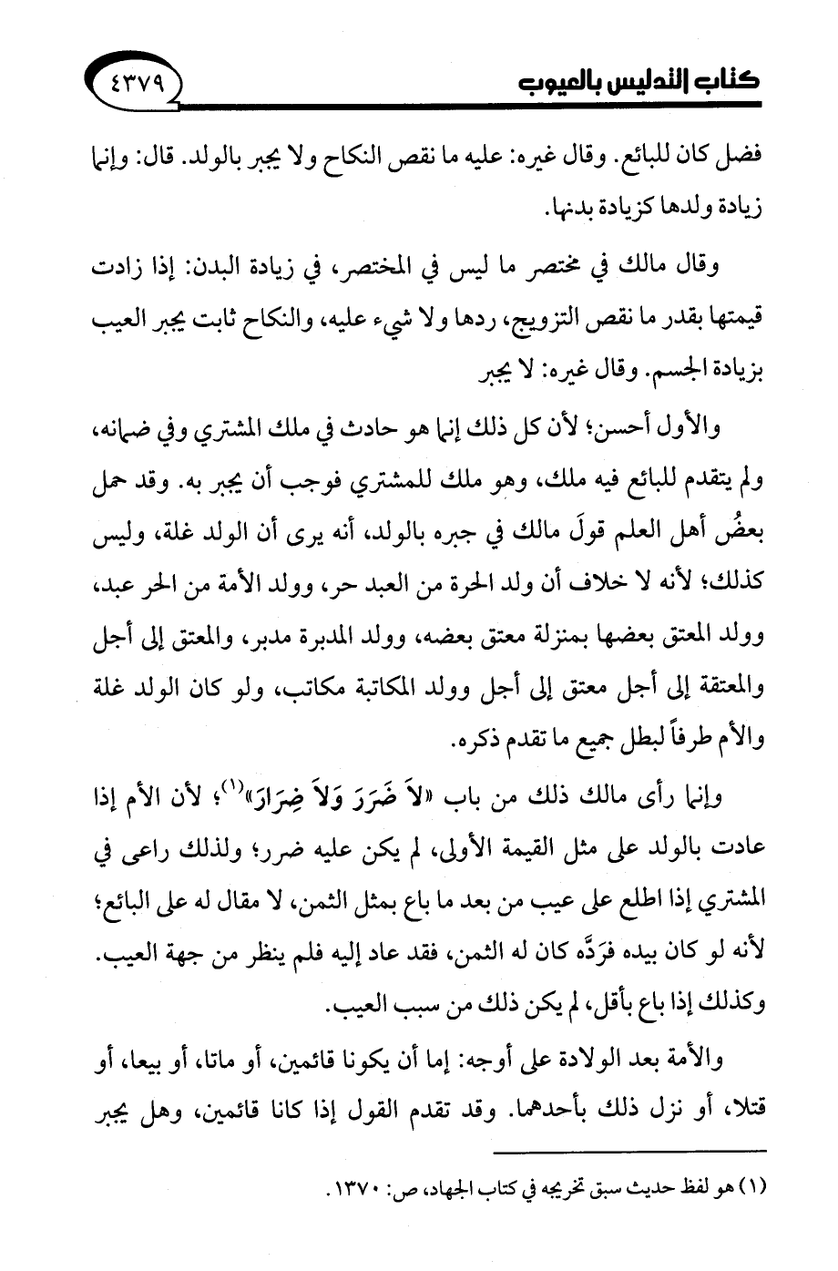 والأول أحسن؛ لأن كل ذلك إنما هو حادث في ملك المشتري وفي ضمانه، ولم يتقدم للبائع فيه ملك، وهو ملك للمشتري فوجب أن يجبر به. وقد حمل بعضُ أهل العلم قولَ مالك في جبره بالولد، أنه يرى أن الولد غلة، وليس كذلك؛ لأنه لا خلاف أن ولد الحرة من العبد حر، وولد الأمة من الحر عبد، وولد المعتق بعضها بمنزلة معتق بعضه، وولد المدبرة مدبر، والمعتق إلى أجل والمعتقة إلى أجل معتق إلى أجل وولد المكاتبة مكاتب، ولو كان الولد غلة والأم طرفًا لبطل جميع ما تقدم ذكره.