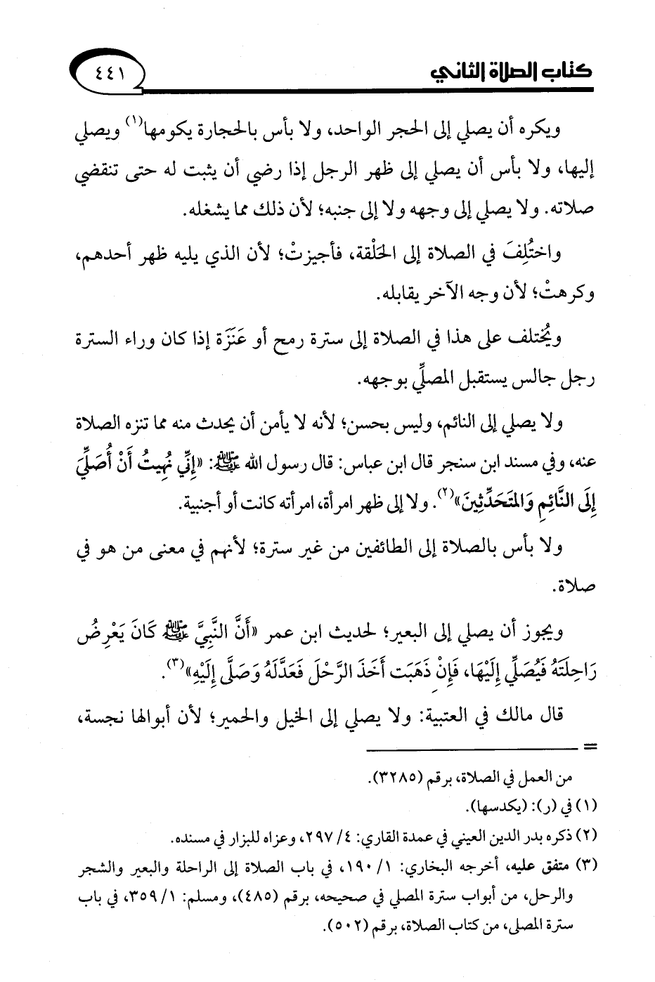 (¬3) متفق عليه، أخرجه البخاري: 1/ 190، في باب الصلاة إلى الراحلة والبعير والشجر والرحل، من أبواب سترة المصلي في صحيحه، برقم (485)، ومسلم: 1/ 359، في باب سترة المصلى، من كتاب الصلاة، برقم (502).