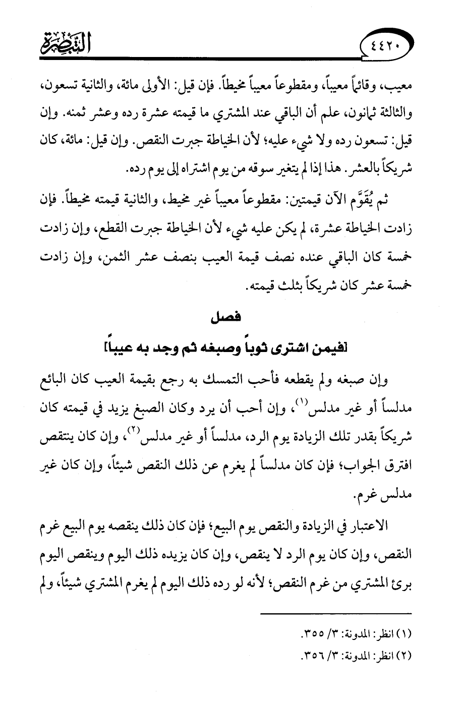 معيب، وقائمًا معيبًا، ومقطوعًا معيبًا مخيطًا. فإن قيل: الأولى مائة، والثانية تسعون، والثالثة ثمانون، علم أن الباقي عند المشتري ما قيمته عشرة رده وعشر ثمنه. وإن قيل: تسعون رده ولا شيء عليه؛ لأن الخياطة جبرت النقص. وإن قيل: مائة، كان شريكًا بالعشر. هذا إذا لم يتغير سوقه من يوم اشتراه إلى يوم رده.