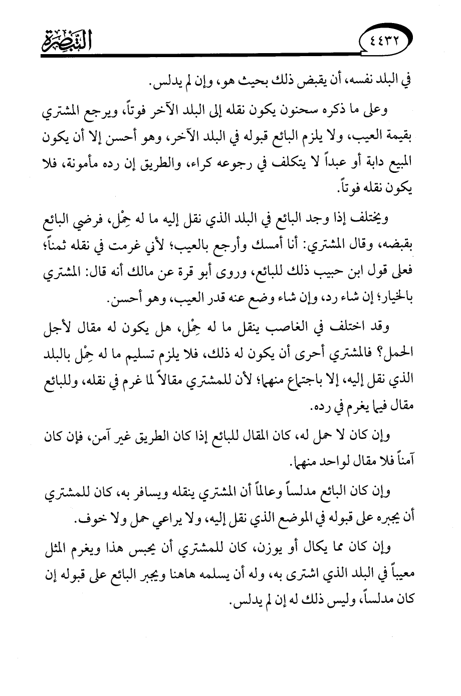 وعلى ما ذكره سحنون يكون نقله إلى البلد الآخر فوتًا، ويرجع المشتري بقيمة العيب، ولا يلزم البائع قبوله في البلد الآخر، وهو أحسن إلا أن يكون المبيع دابة أو عبدًا لا يتكلف في رجوعه كراء، والطريق إن رده مأمونة، فلا يكون نقله فوتًا.