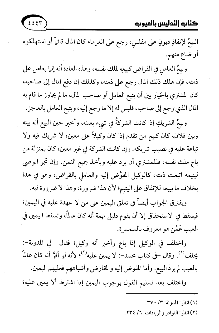 واختلف في الوكيل إذا باع وأخبر أنه وكيل، فقال -في المدونة-: يحلف (¬1). وقال -في كتاب محمد-: لا يمين عليه (¬2)؛ لأنه لو أقرَّ أنه كان عالمًا بالعيب لم يرد البيع. وأما المفوض إليه والمقارض وأشباههم فعليهم اليمين.