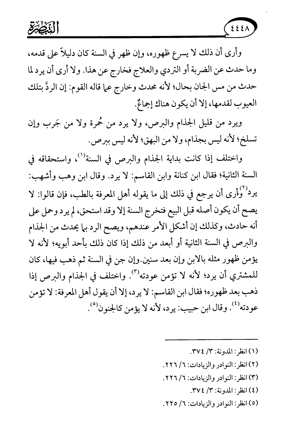 واختلف إذا كانت بداية الجذام والبرص في السنة (¬1)، واستحقاقه في السنة الثانية، فقال ابن كنانة وابن القاسم: لا يرد. وقال ابن وهب وأشهب: يرد (¬2) وأرى أن يرجع في ذلك إلى ما يقوله أهل المعرفة بالطب، فإن قالوا: لا يصح أن يكون أصله قبل البيع فتخرج السنة إلا وقد استحق، لم يرد وحمل على أنه حادث، وكذلك إن أشكل الأمر عندهم، ويصح الرد بما يحدث من الجذام والبرص في السنة الثانية أو أبعد من ذلك إذا كان ذلك بأحد أبويه؛ لأنه لا يؤمن ظهور مثله بالابن وإن بعد سنين. وإن جن في السنة ثم ذهب فيها، كان للمشتري أن يرد؛ لأنه لا تؤمن عودته (¬3). واختلف في الجذام والبرص إذا ذهب بعد ظهوره، فقال ابن القاسم: لا يرد، إلا أن يقول أهل المعرفة: لا تؤمن عودته (¬4). وقال ابن حبيب: يرد؛ لأنه لا يؤمن كالجنون (¬5).
