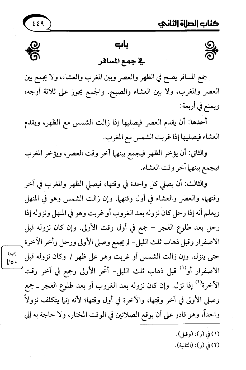 جمع المسافر يصح في الظهر والعصر وبين المغرب والعشاء، ولا يجمع بين العصر والمغرب، ولا بين العشاء والصبح. والجمع يجوز على ثلاثة أوجه، ويمنع في أربعة: