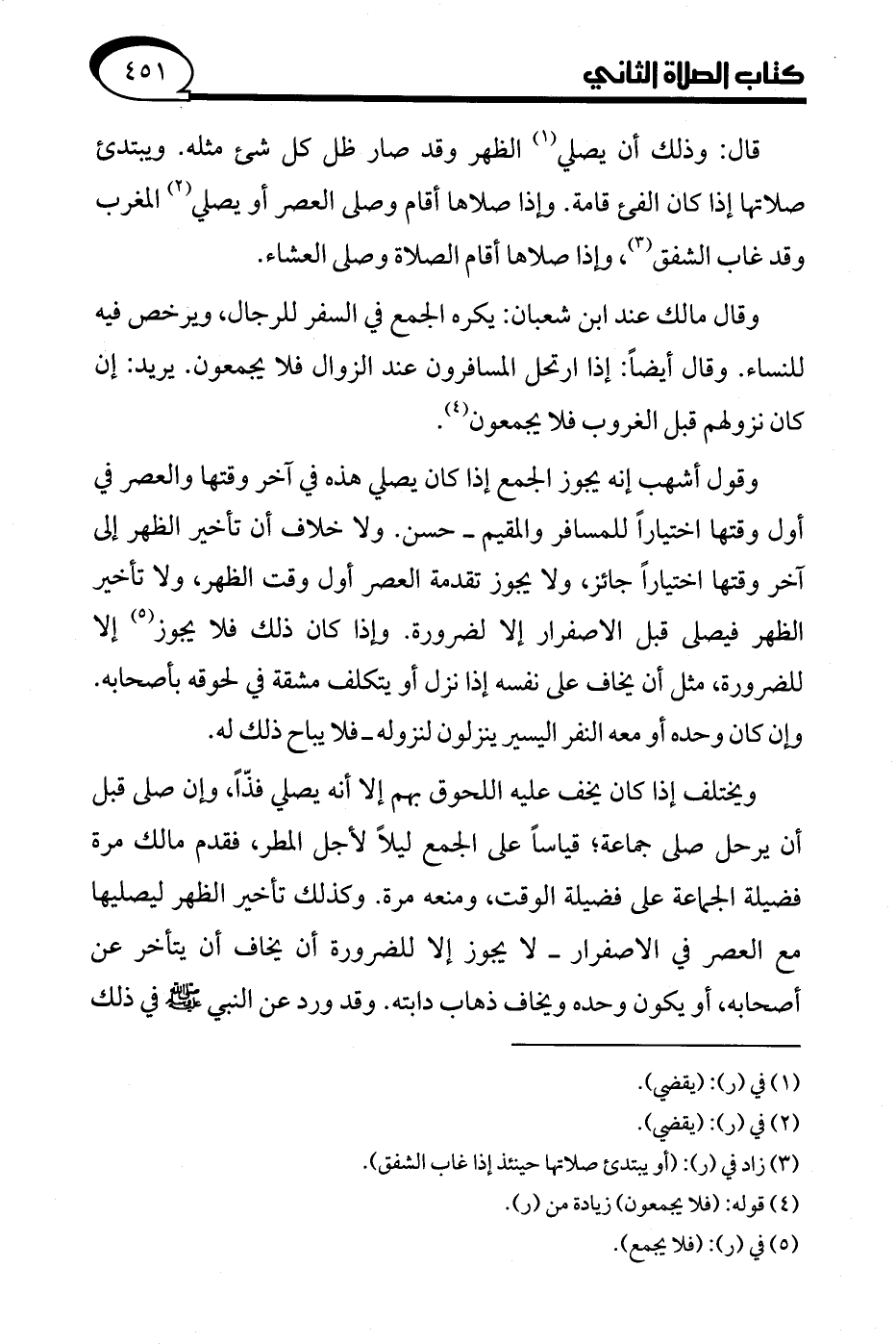 ويختلف إذا كان يخف عليه اللحوق بهم إلا أنه يصلي فذًّا، وإن صلى قبل أن يرحل صلى جماعة؛ قياسًا على الجمع ليلًا لأجل المطر، فقدم مالك مرة فضيلة الجماعة على فضيلة الوقت، ومنعه مرة. وكذلك تأخير الظهر ليصليها مع العصر في الاصفرار- لا يجوز إلا للضرورة أن يخاف أن يتأخر عن أصحابه، أو يكون وحده ويخاف ذهاب دابته. وقد ورد عن النبي - صلى الله عليه وسلم - في ذلك