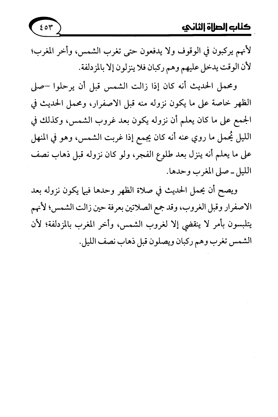 ومحمل الحديث أنه كان إذا زالت الشمس قبل أن يرحلوا - صلى الظهر خاصة على ما يكون نزوله منه قبل الاصفرار، ومحمل الحديث في الجمع على ما كان يعلم أن نزوله يكون بعد غروب الشمس، وكذلك في الليل يُحمل ما روي عنه أنه كان يجمع إذا غربت الشمس، وهو في المنهل على ما يعلم أنه ينزل بعد طلوع الفجر، ولو كان نزوله قبل ذهاب نصف الليل- صلى المغرب وحدها.