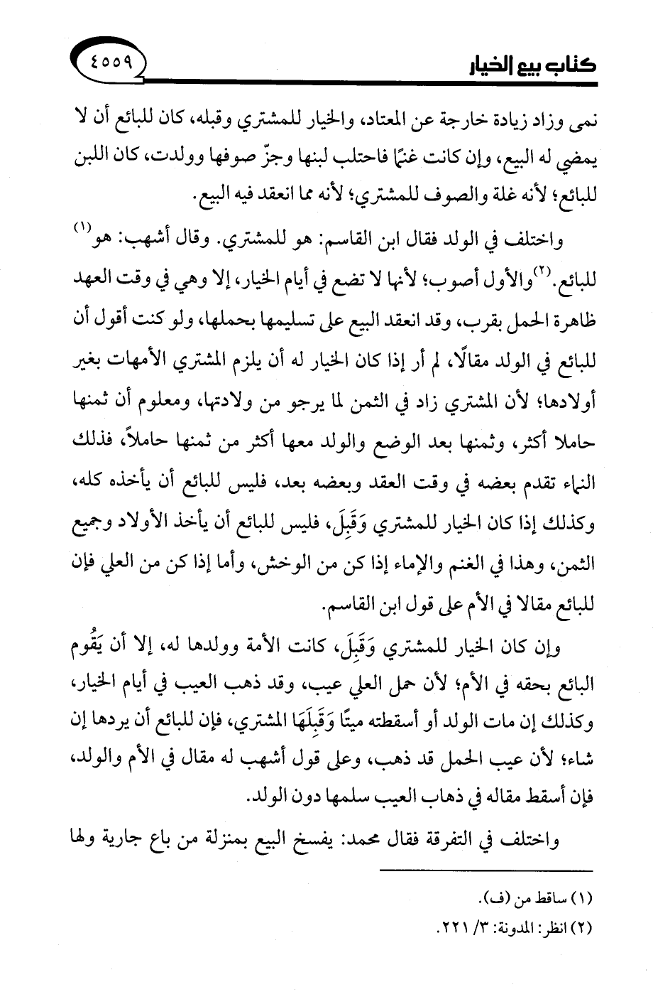 واختلف في الولد فقال ابن القاسم: هو للمشتري. وقال أشهب: هو (¬1) للبائع. (¬2) والأول أصوب؛ لأنها لا تضع في أيام الخيار، إلا وهي في وقت العهد ظاهرة الحمل بقرب، وقد انعقد البيع على تسليمها بحملها، ولو كنت أقول أن للبائع في الولد مقالًا، لم أر إذا كان الخيار له أن يلزم المشتري الأمهات بغير أولادها؛ لأن المشتري زاد في الثمن لما يرجو من ولادتها، ومعلوم أن ثمنها حاملا أكثر، وثمنها بعد الوضع والولد معها أكثر من ثمنها حاملًا، فذلك النماء تقدم بعضه في وقت العقد وبعضه بعد، فليس للبائع أن يأخذه كله، وكذلك إذا كان الخيار للمشتري وَقَبِلَ، فليس للبائع أن يأخذ الأولاد وجميع الثمن، وهذا في الغنم والإماء إذا كن من الوخش، وأما إذا كن من العلي فإن للبائع مقالا في الأم على قول ابن القاسم.